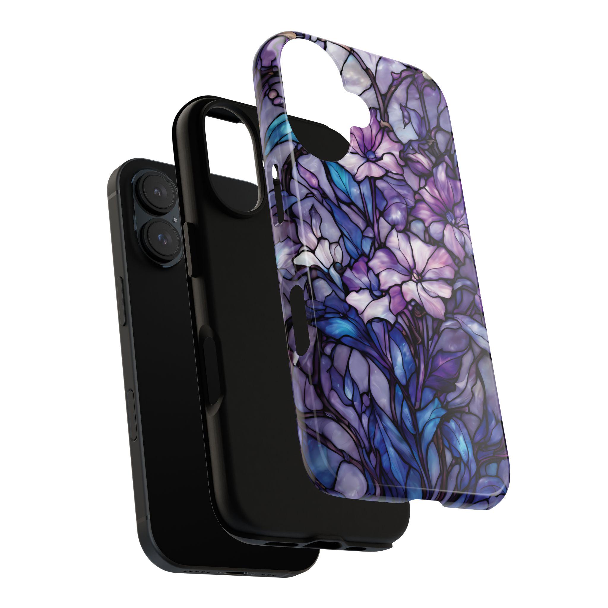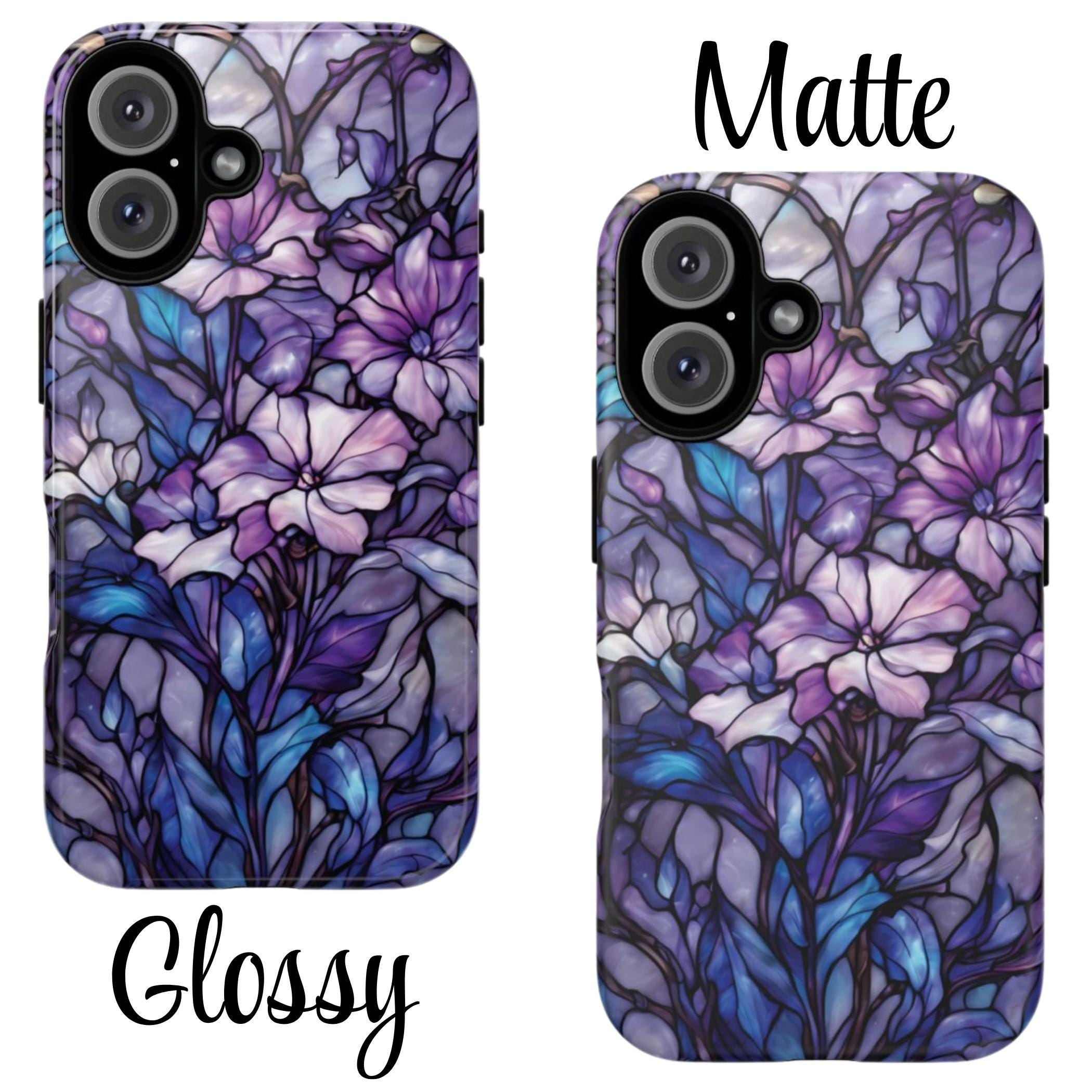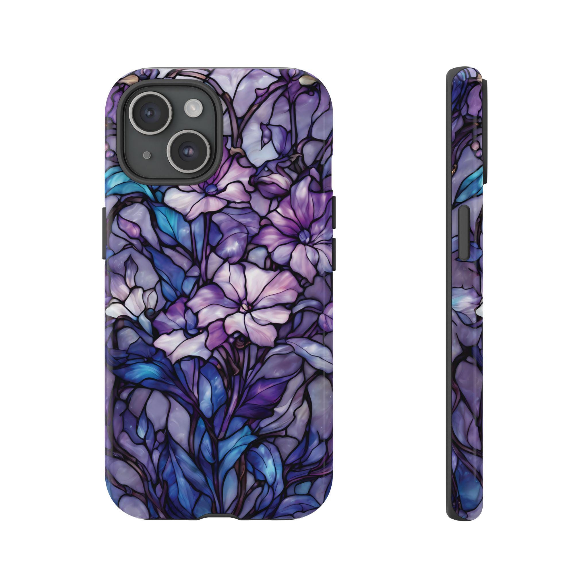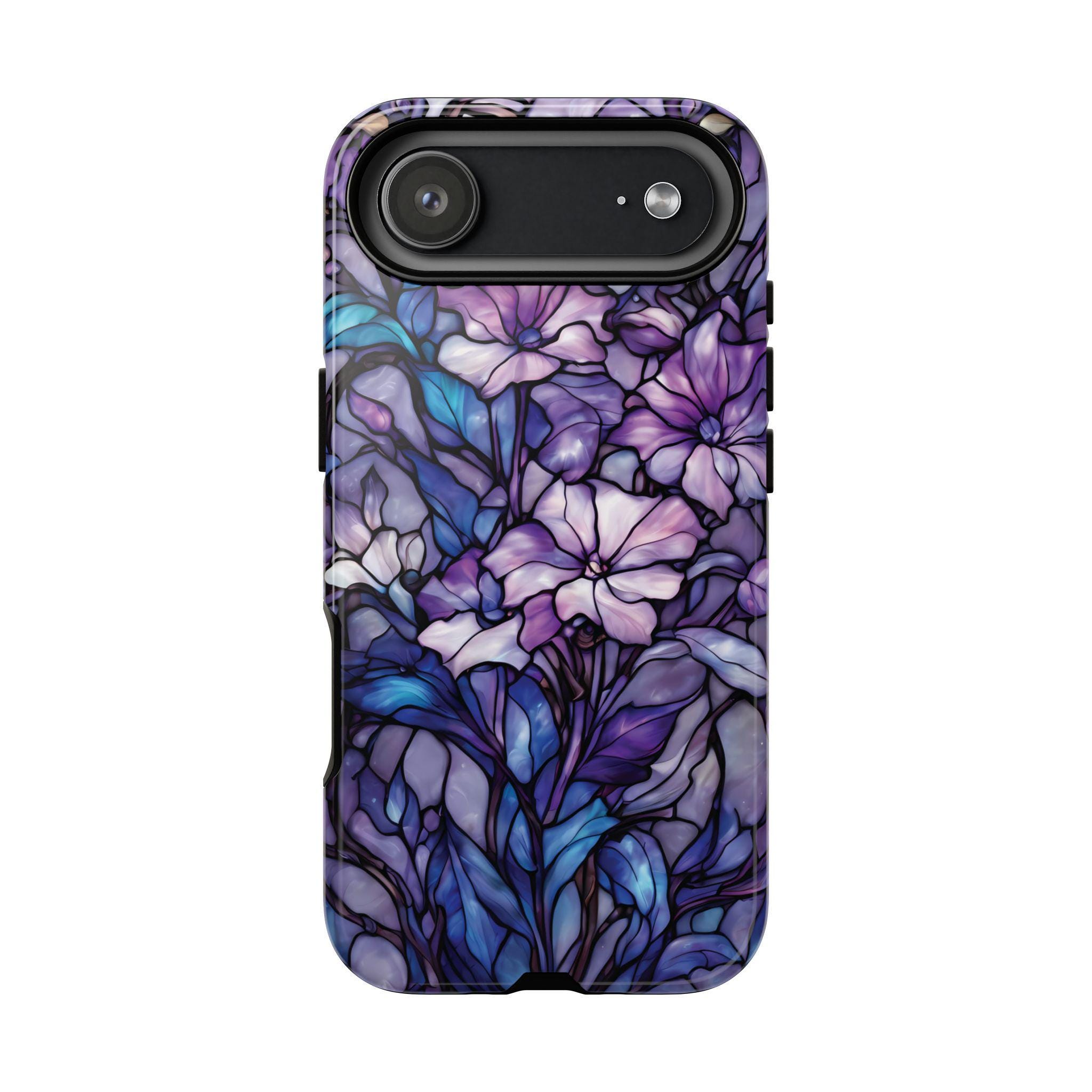 Turn everyday protection into a work of art. This floral tough phone case features a luminous stained-glass design, blending soft purples, indigo blues, and delicate botanical details into a rich, flowing composition. Each petal and leaf is outlined like handcrafted glass, creating depth, elegance, and a subtly moody glow. Built to protect while standing out, this case is perfect for those who love artistic details, floral aesthetics, and a touch of dramatic beauty in their everyday essentials.