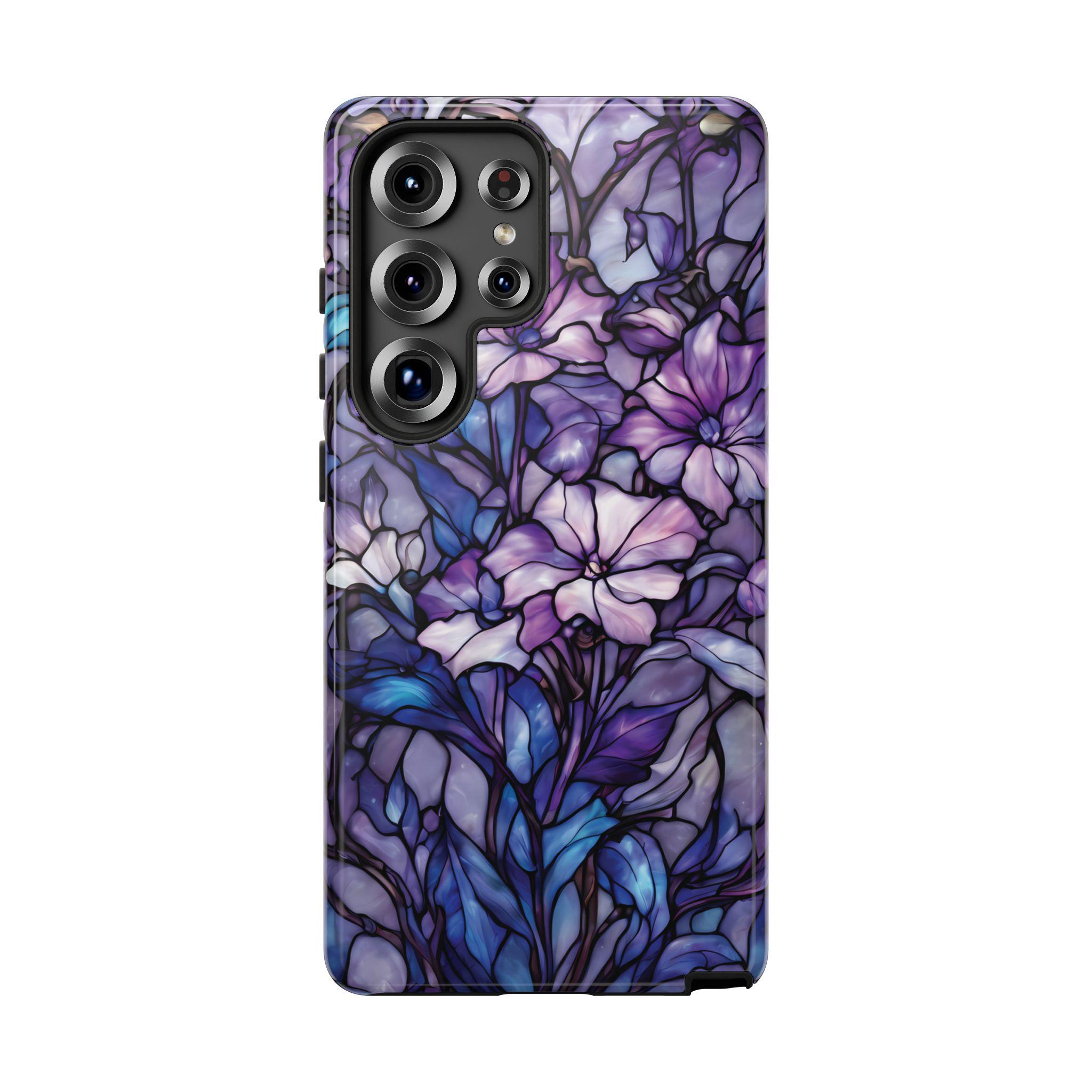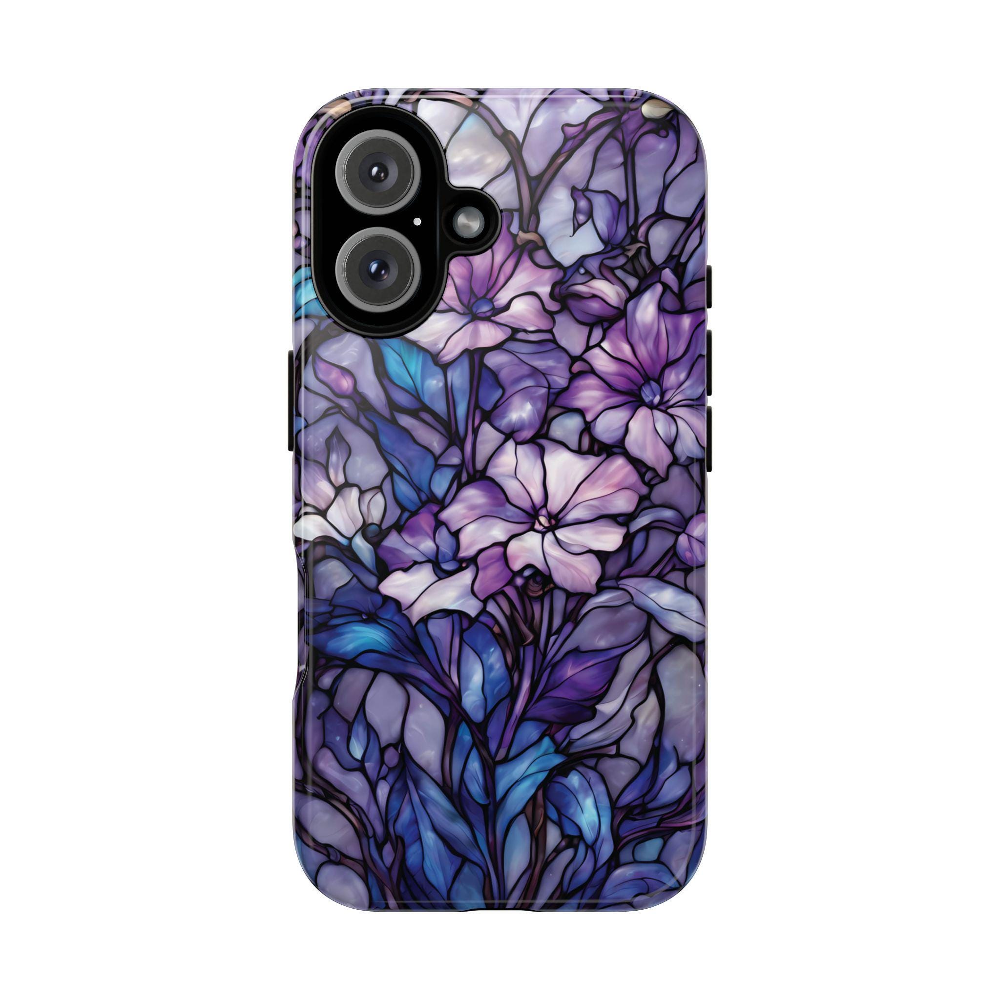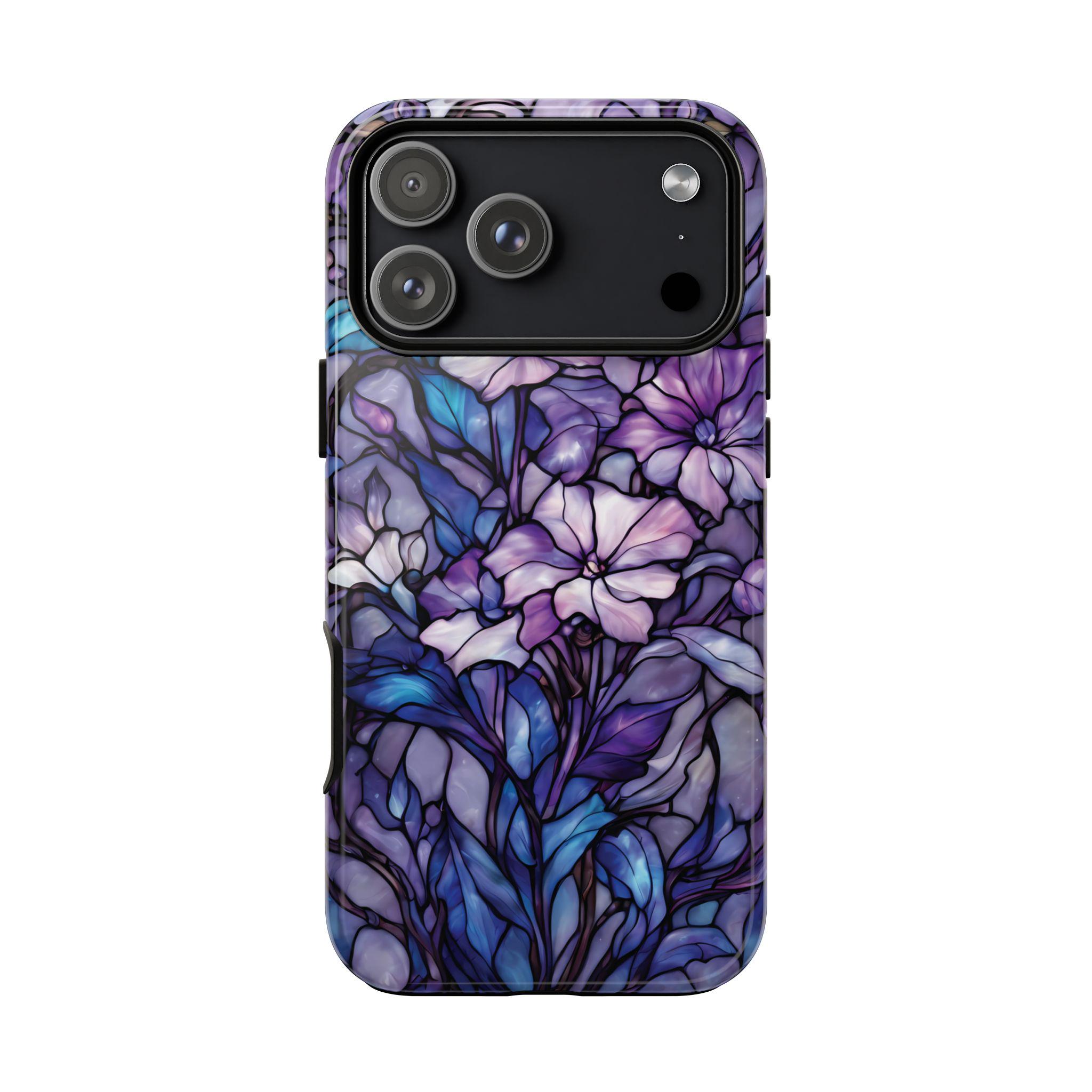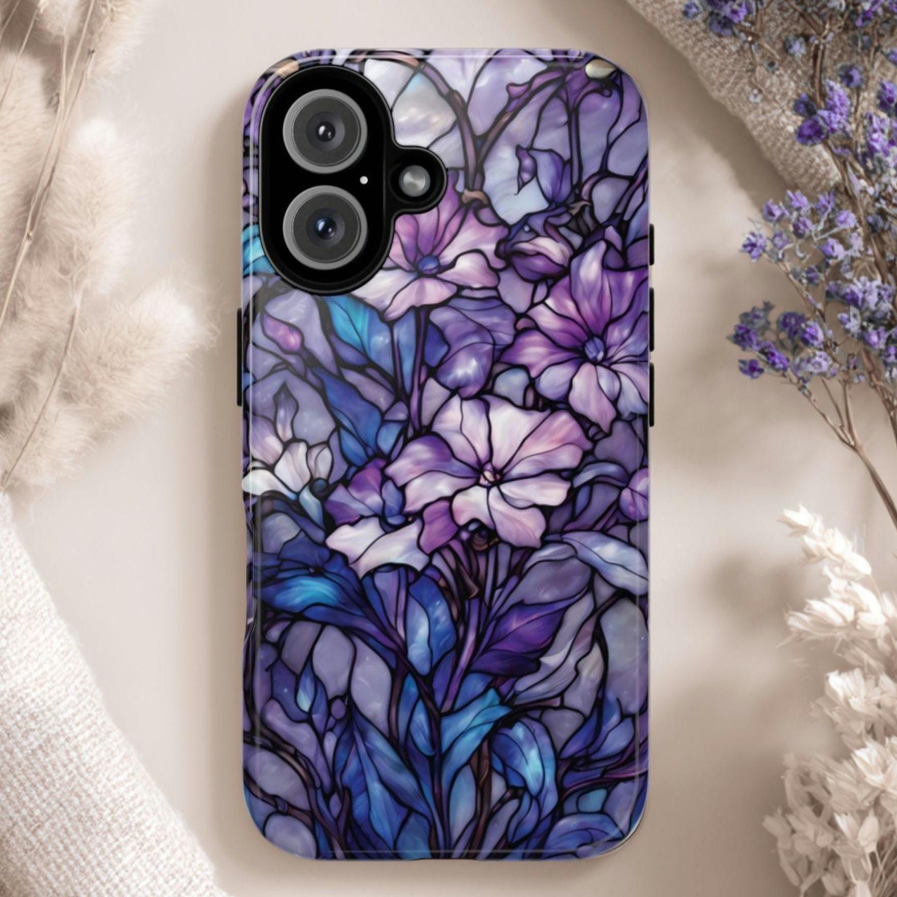 Turn everyday protection into a work of art. This floral tough phone case features a luminous stained-glass design, blending soft purples, indigo blues, and delicate botanical details into a rich, flowing composition. Each petal and leaf is outlined like handcrafted glass, creating depth, elegance, and a subtly moody glow. Built to protect while standing out, this case is perfect for those who love artistic details, floral aesthetics, and a touch of dramatic beauty in their everyday essentials.