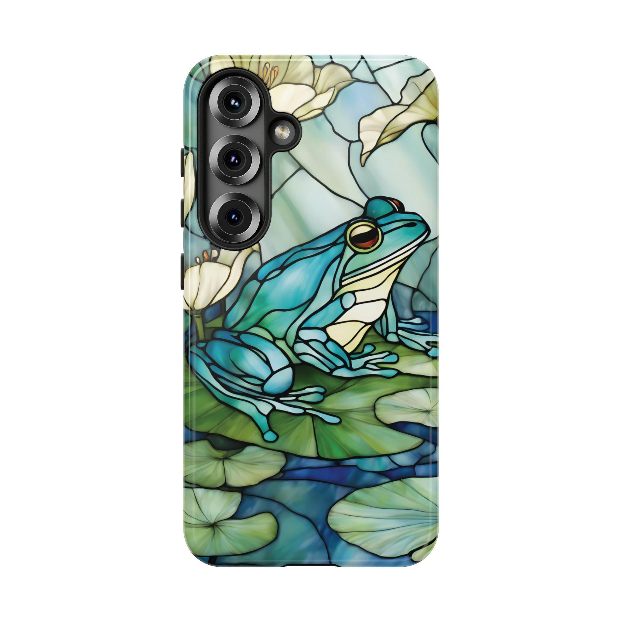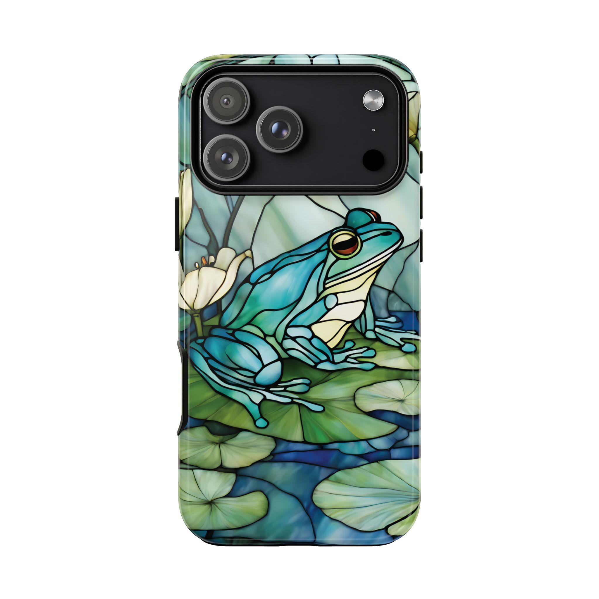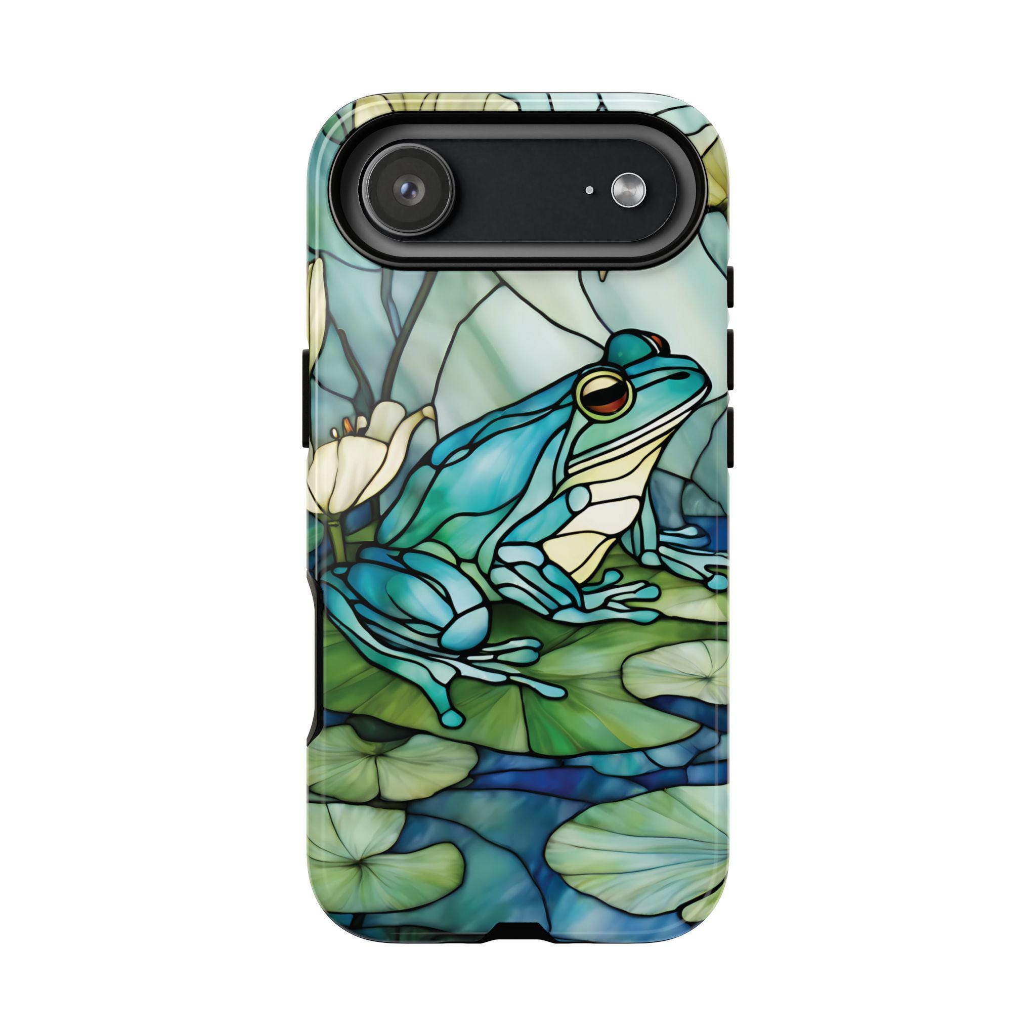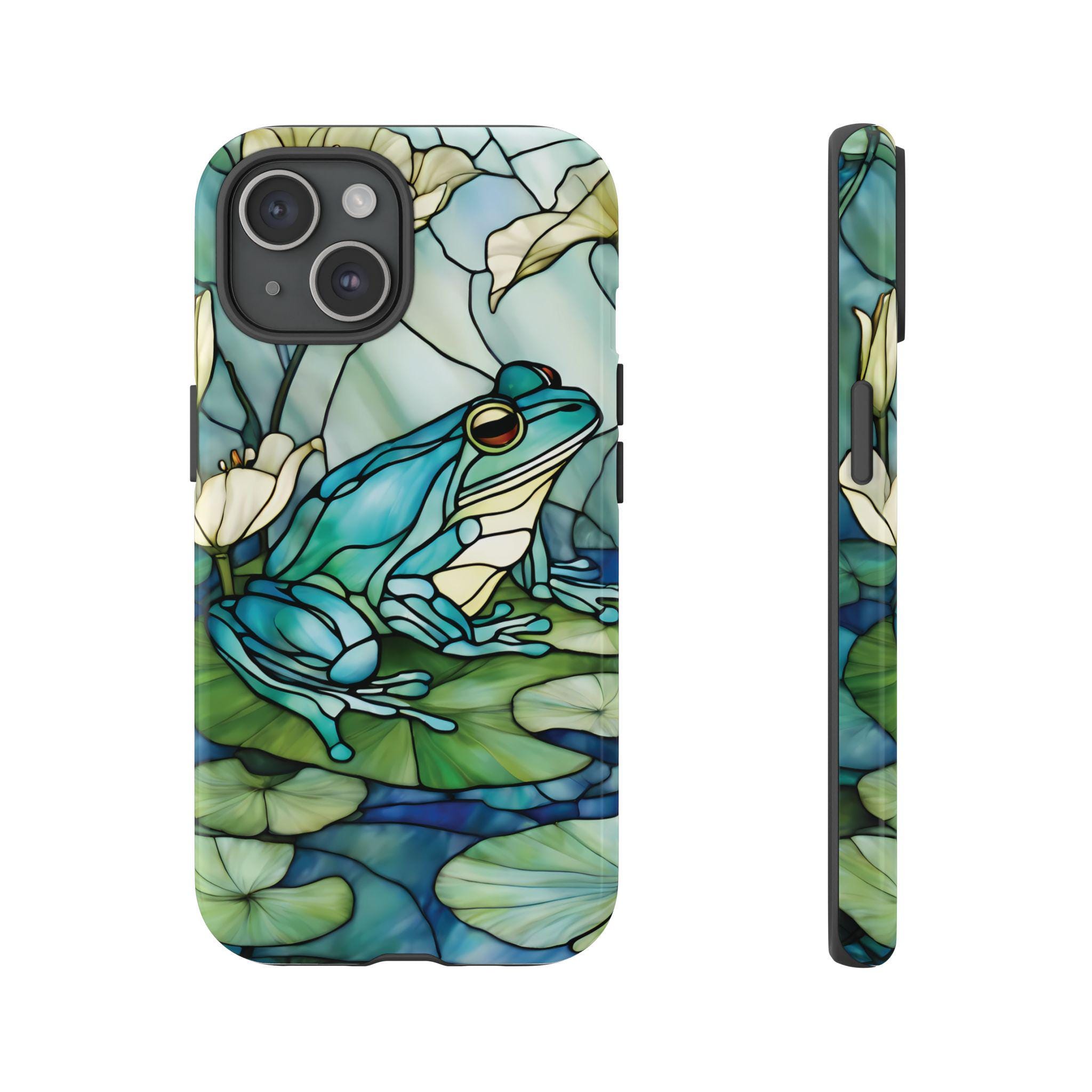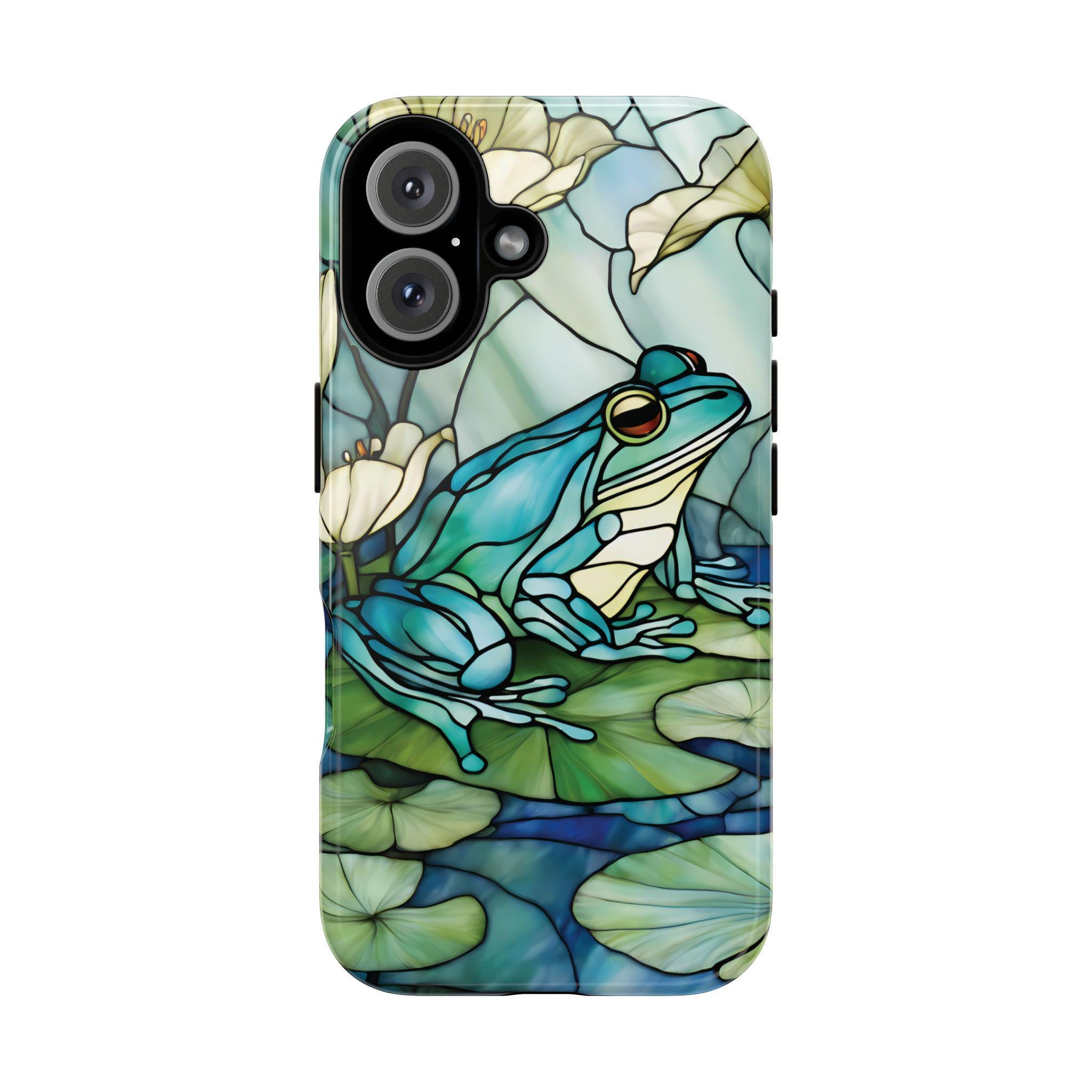 Turn your phone into a small work of art with this stained glass inspired frog tough phone case. Featuring rich blue and green tones and a peaceful lily pad scene, this design captures the timeless beauty of stained glass while offering reliable, everyday protection. Perfect for those who love nature, color, and unique artistic accessories.