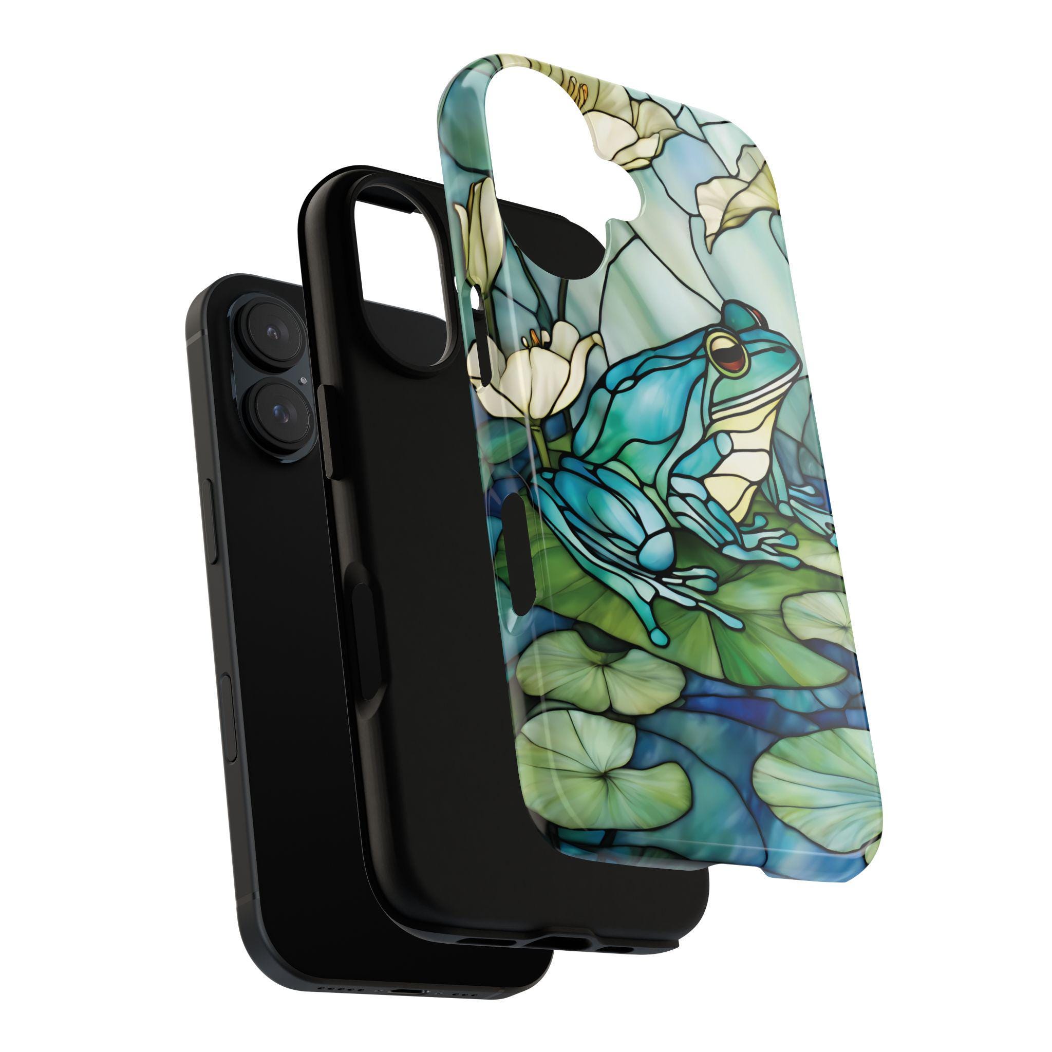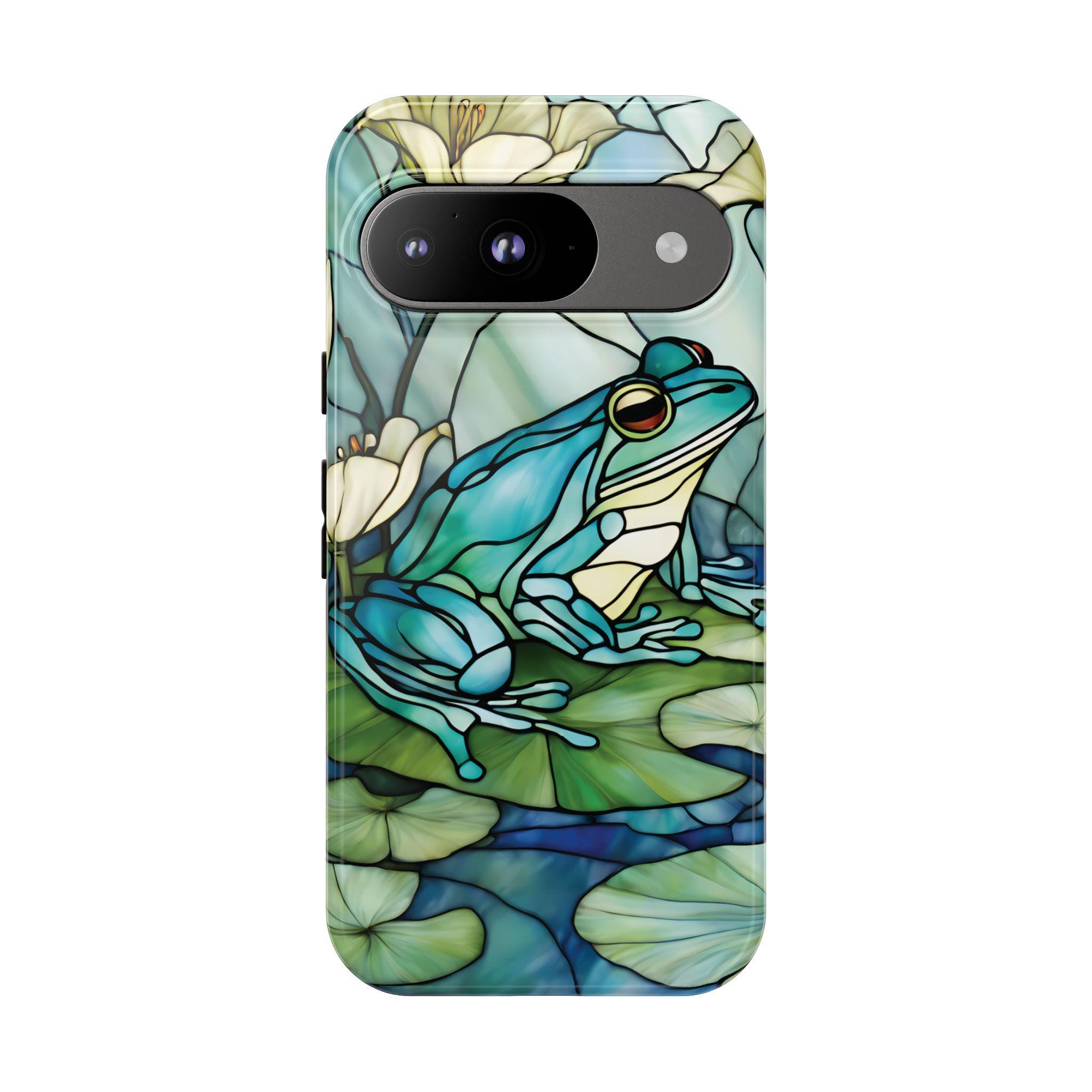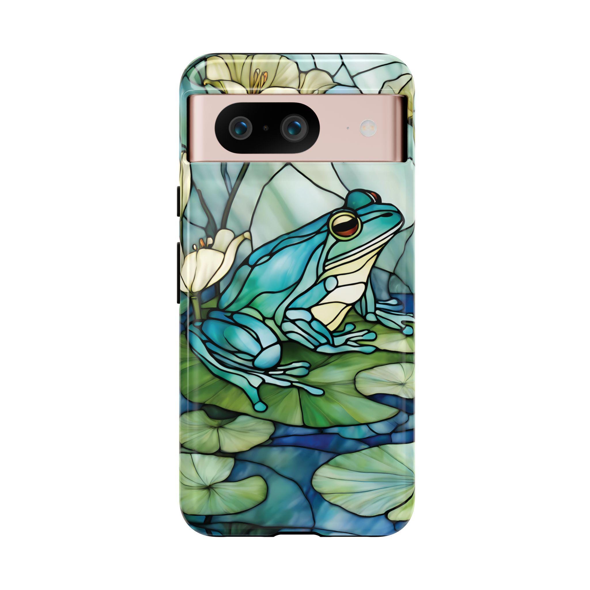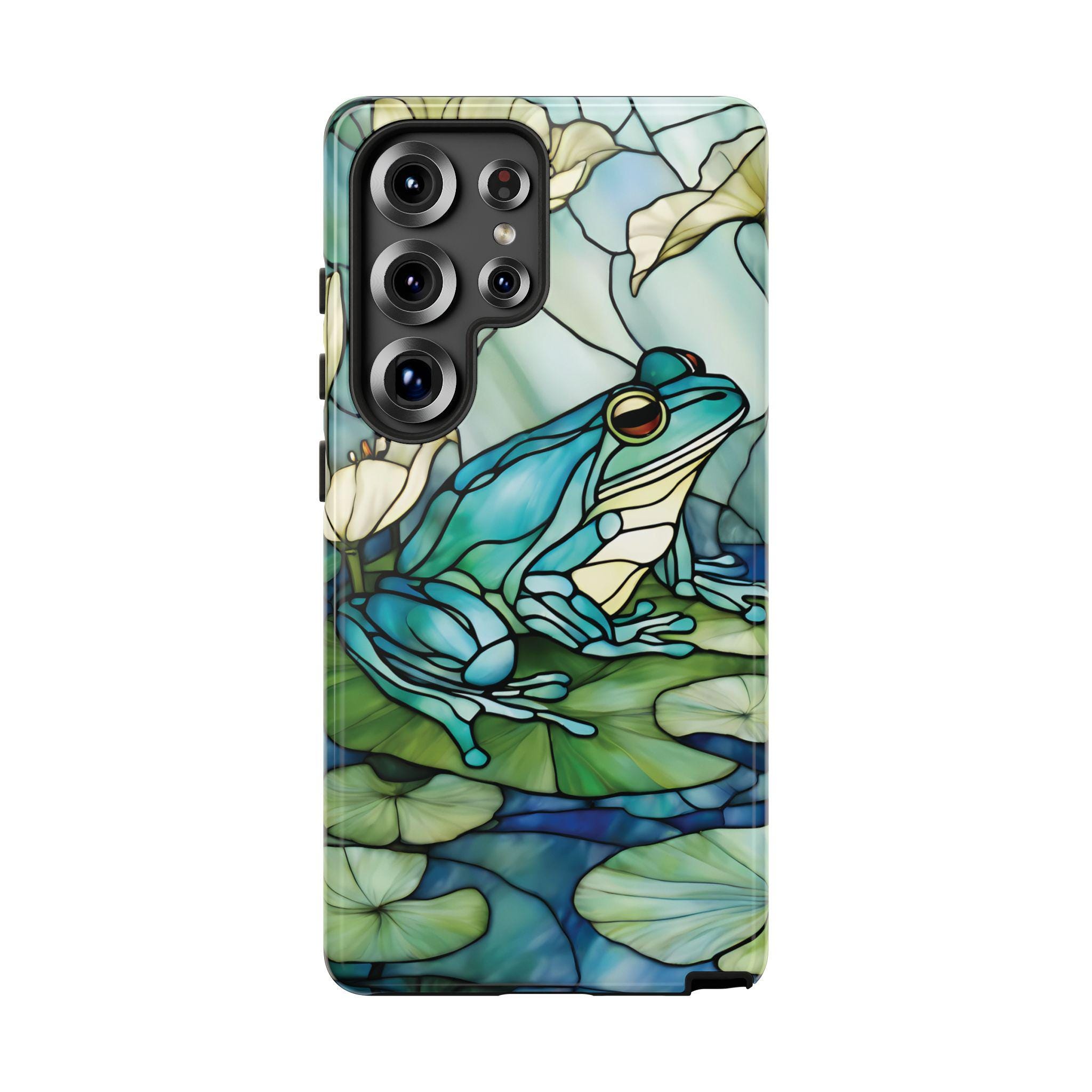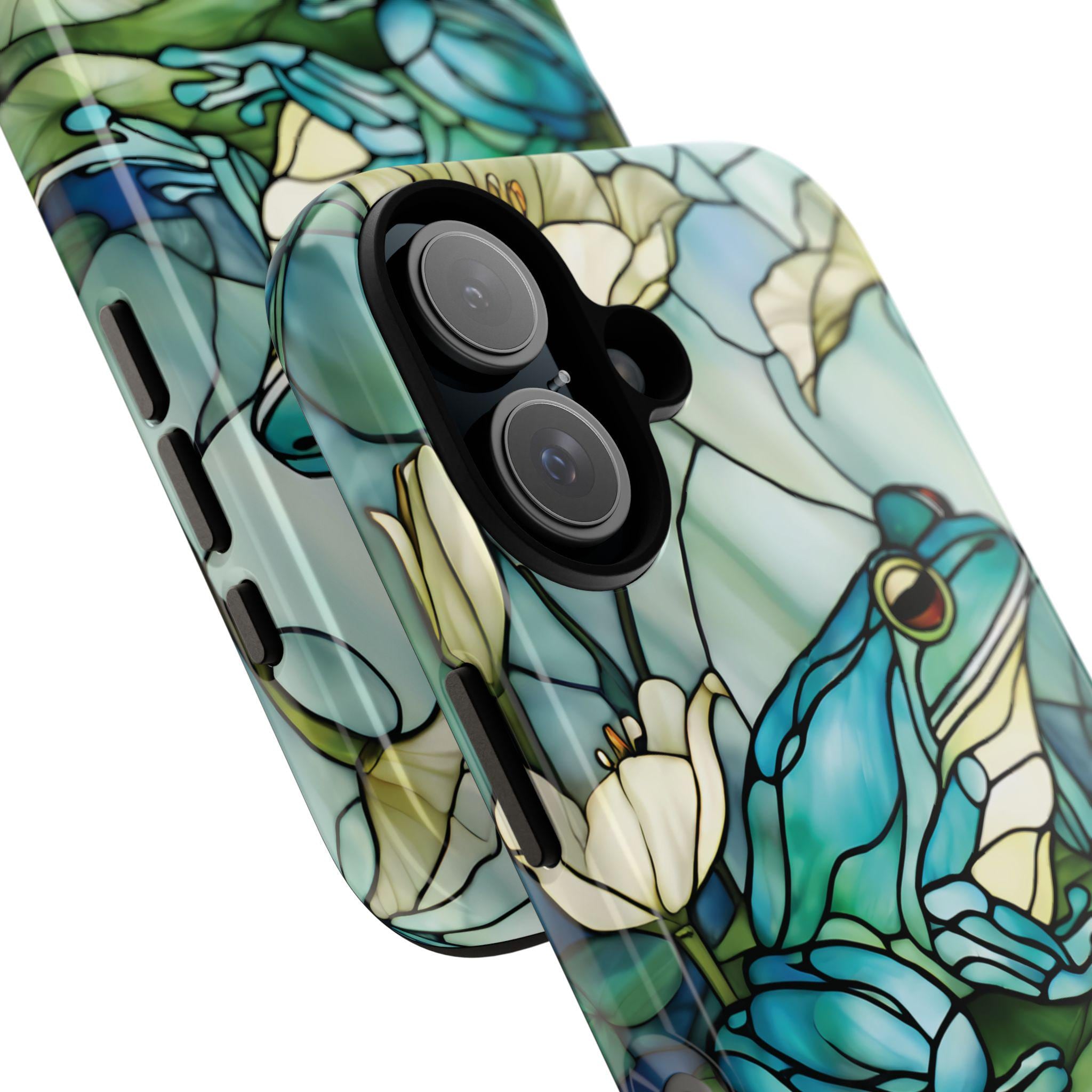 Turn your phone into a small work of art with this stained glass inspired frog tough phone case. Featuring rich blue and green tones and a peaceful lily pad scene, this design captures the timeless beauty of stained glass while offering reliable, everyday protection. Perfect for those who love nature, color, and unique artistic accessories.