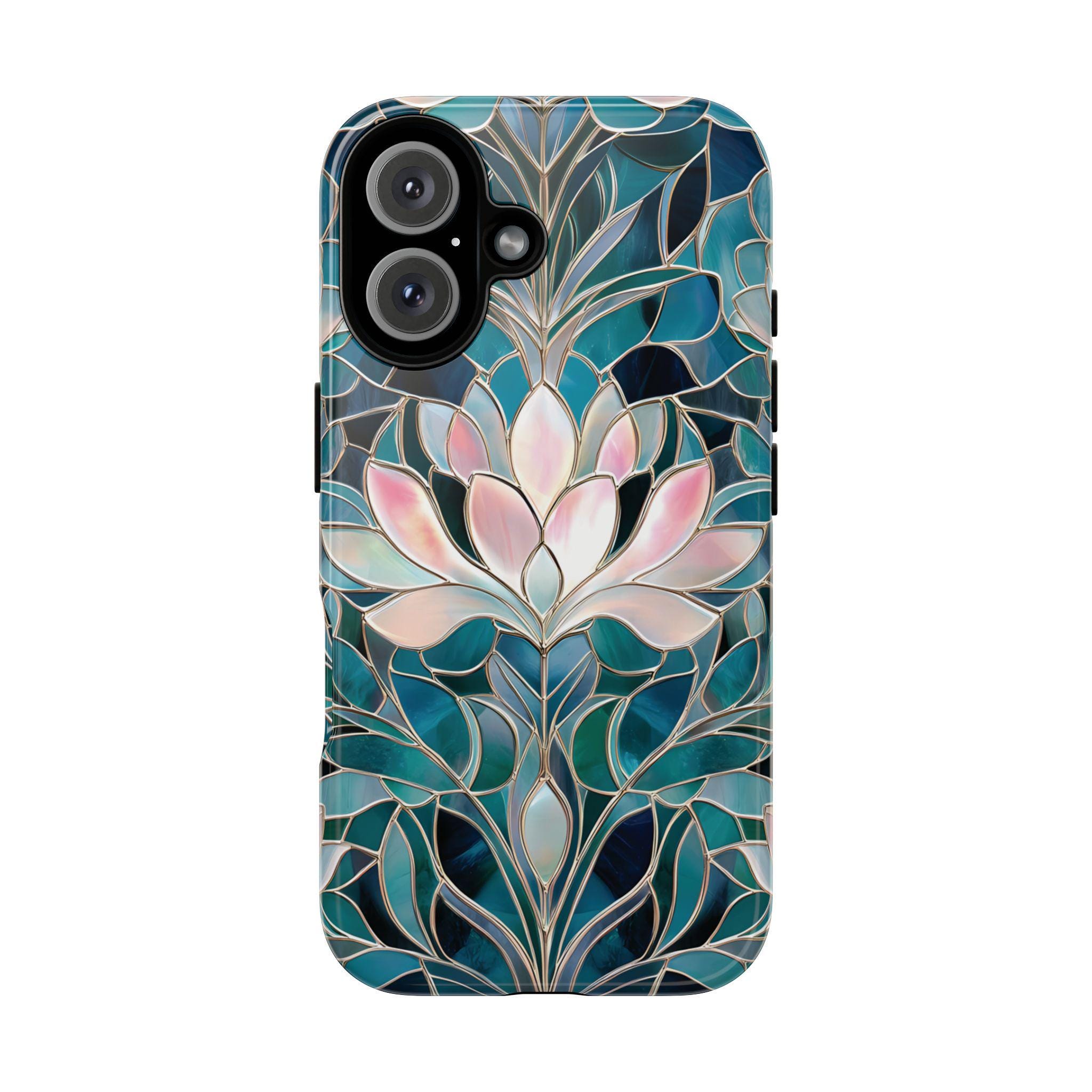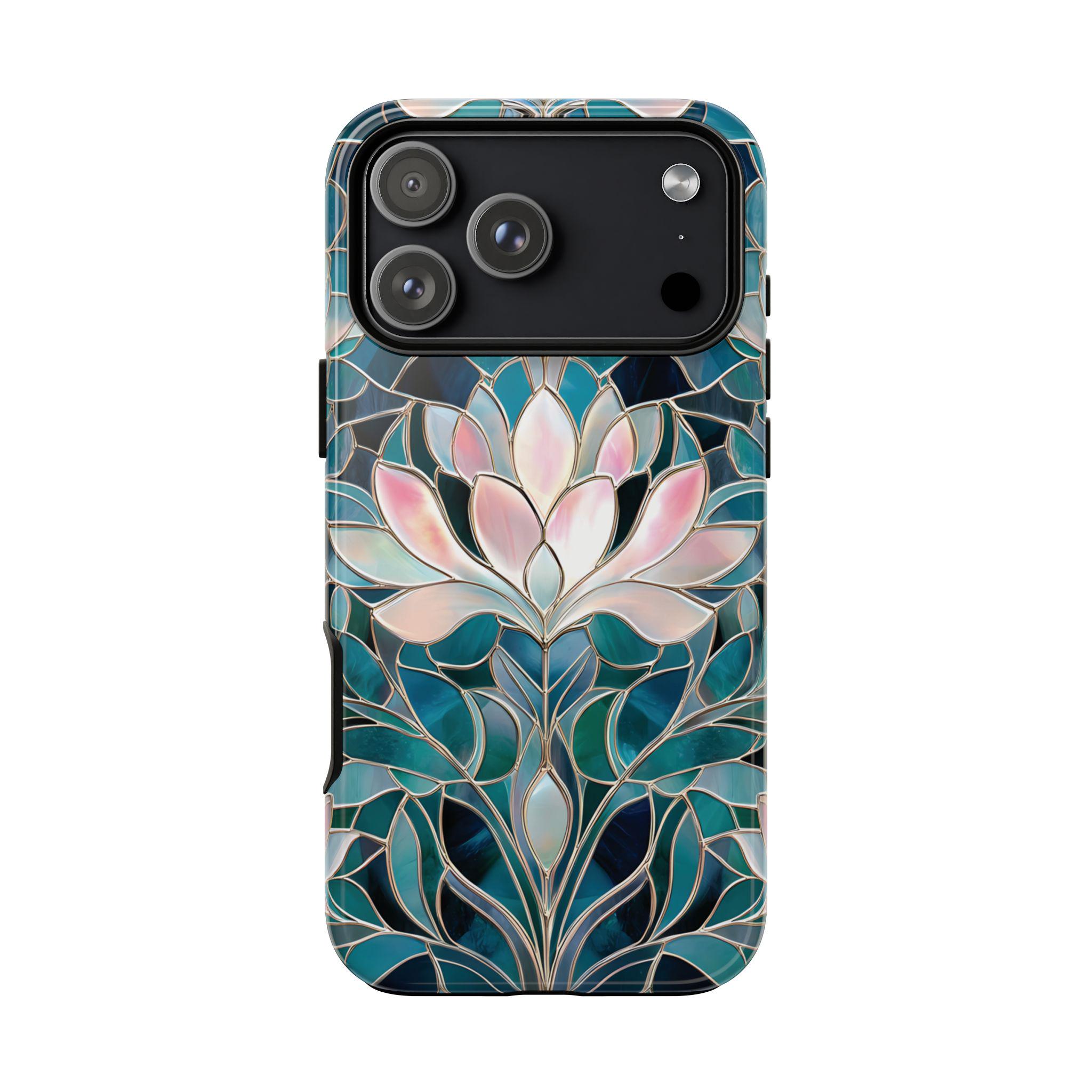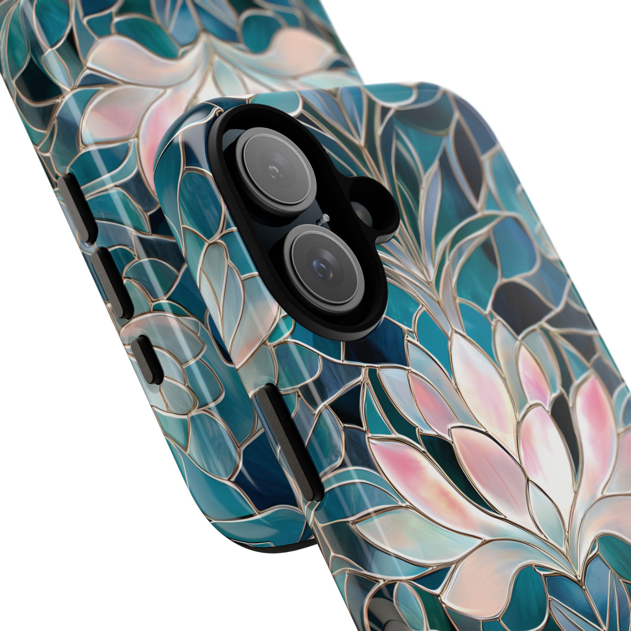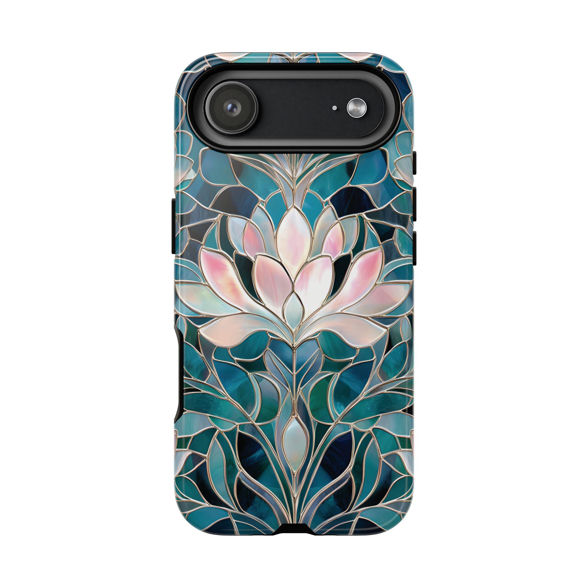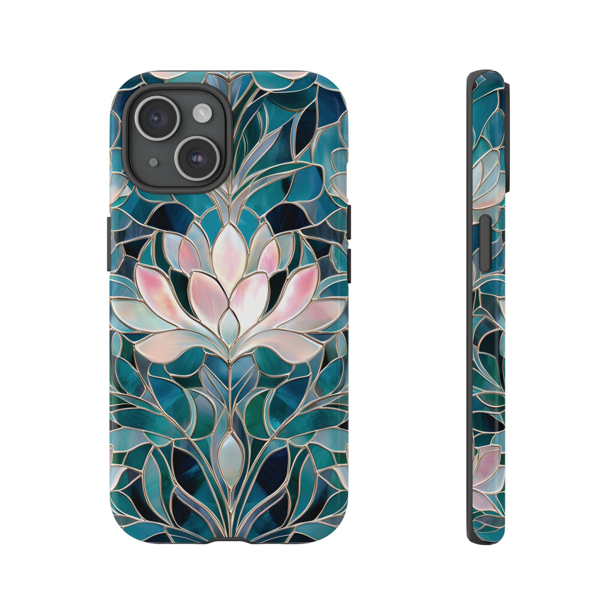 Protect your phone in style with this lotus flower tough phone case. Featuring a stained glass–inspired floral design in teal, blue, and soft pink tones, this case combines beauty and durability. Made with a dual-layer protective shell, it offers strong shock absorption while keeping a slim, comfortable feel.
