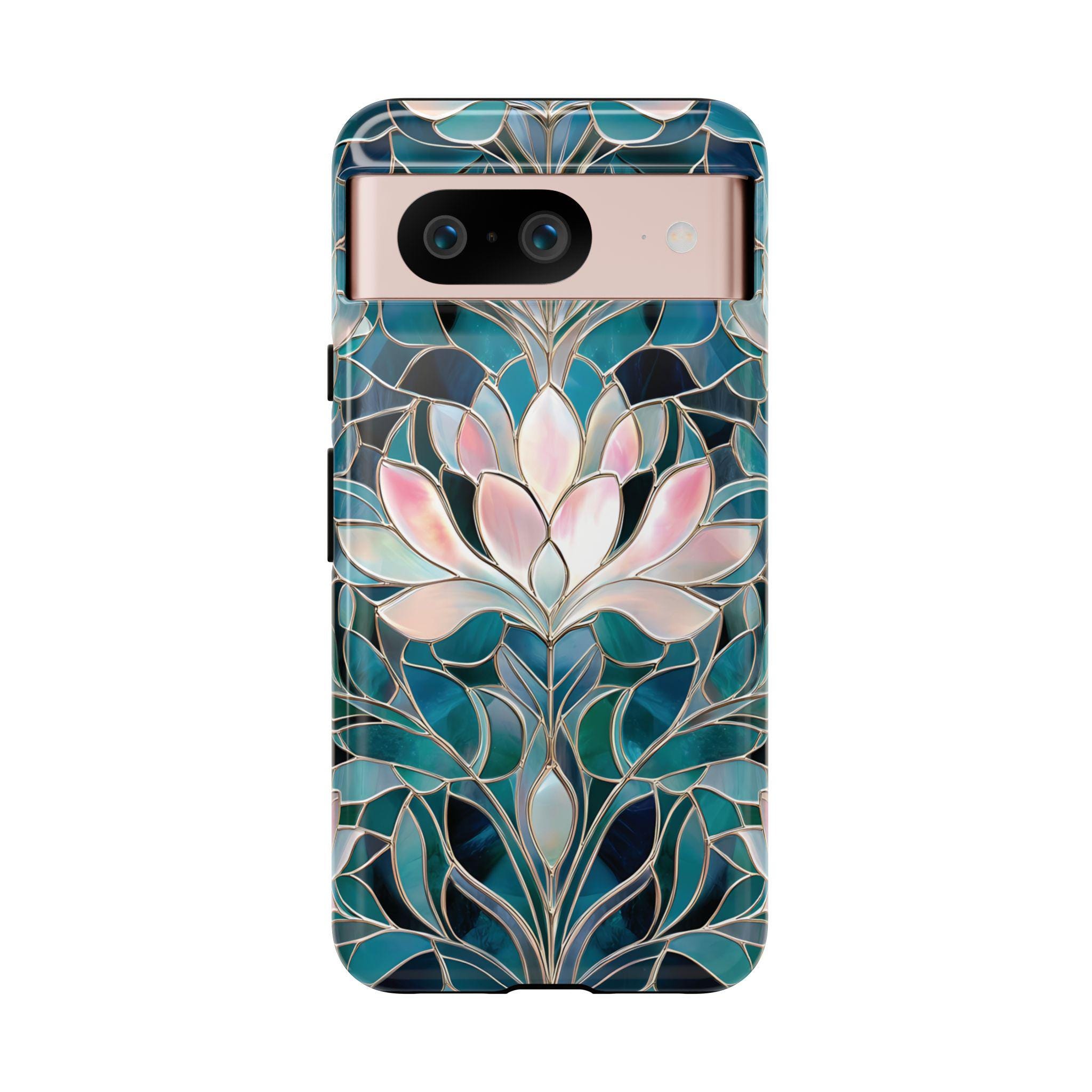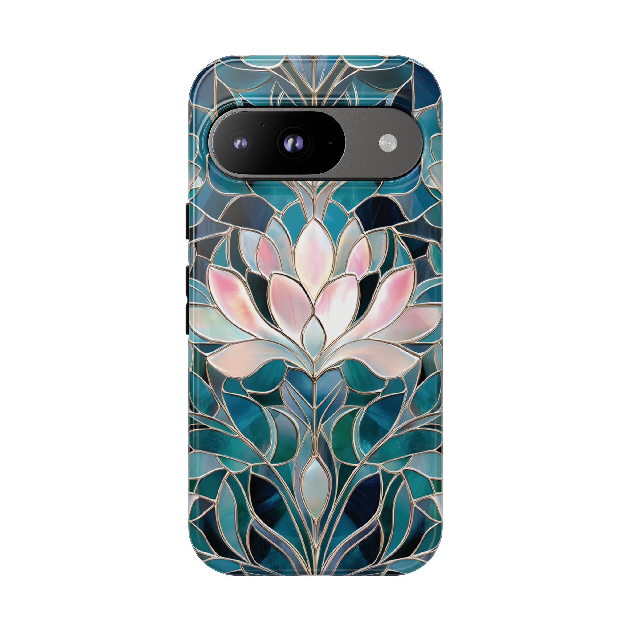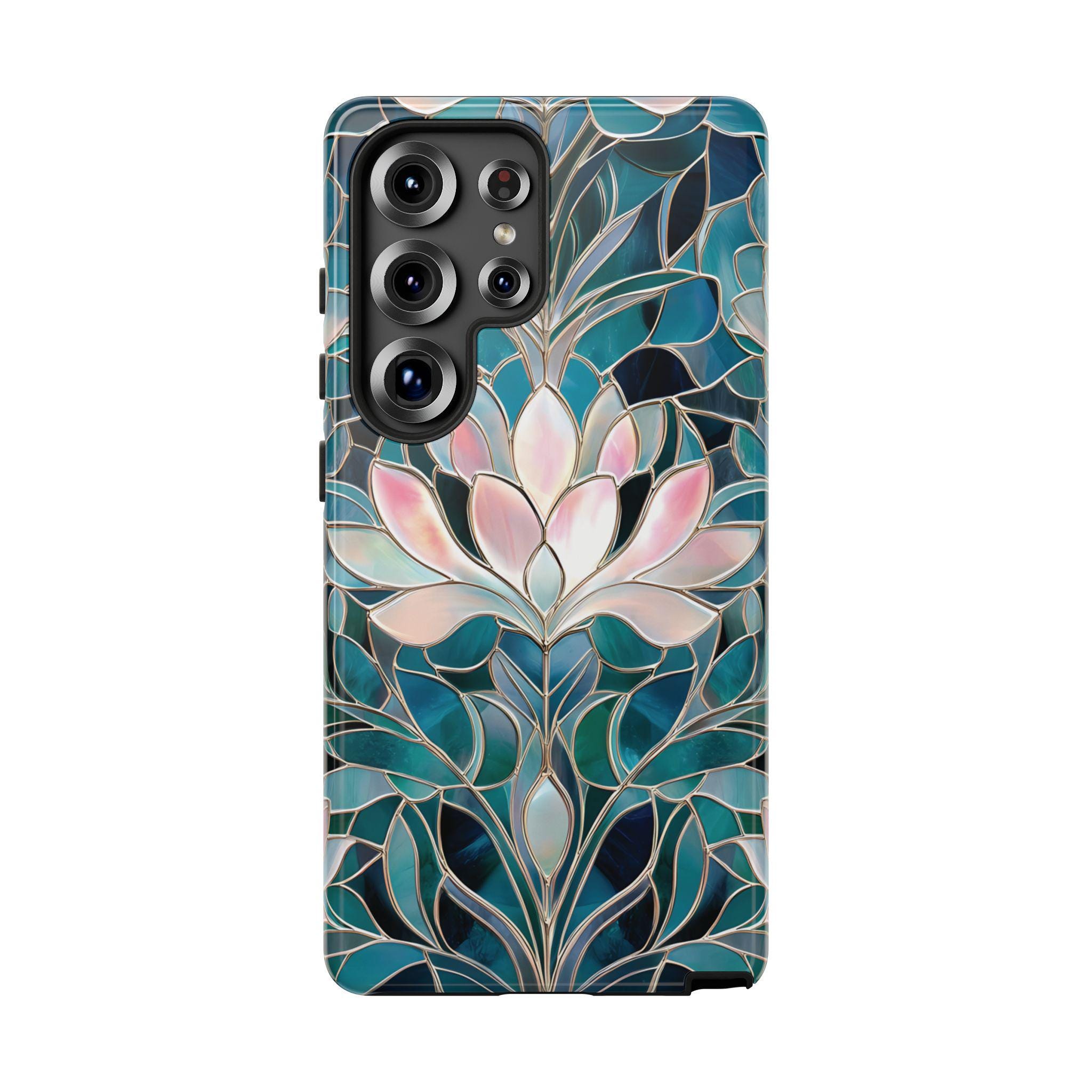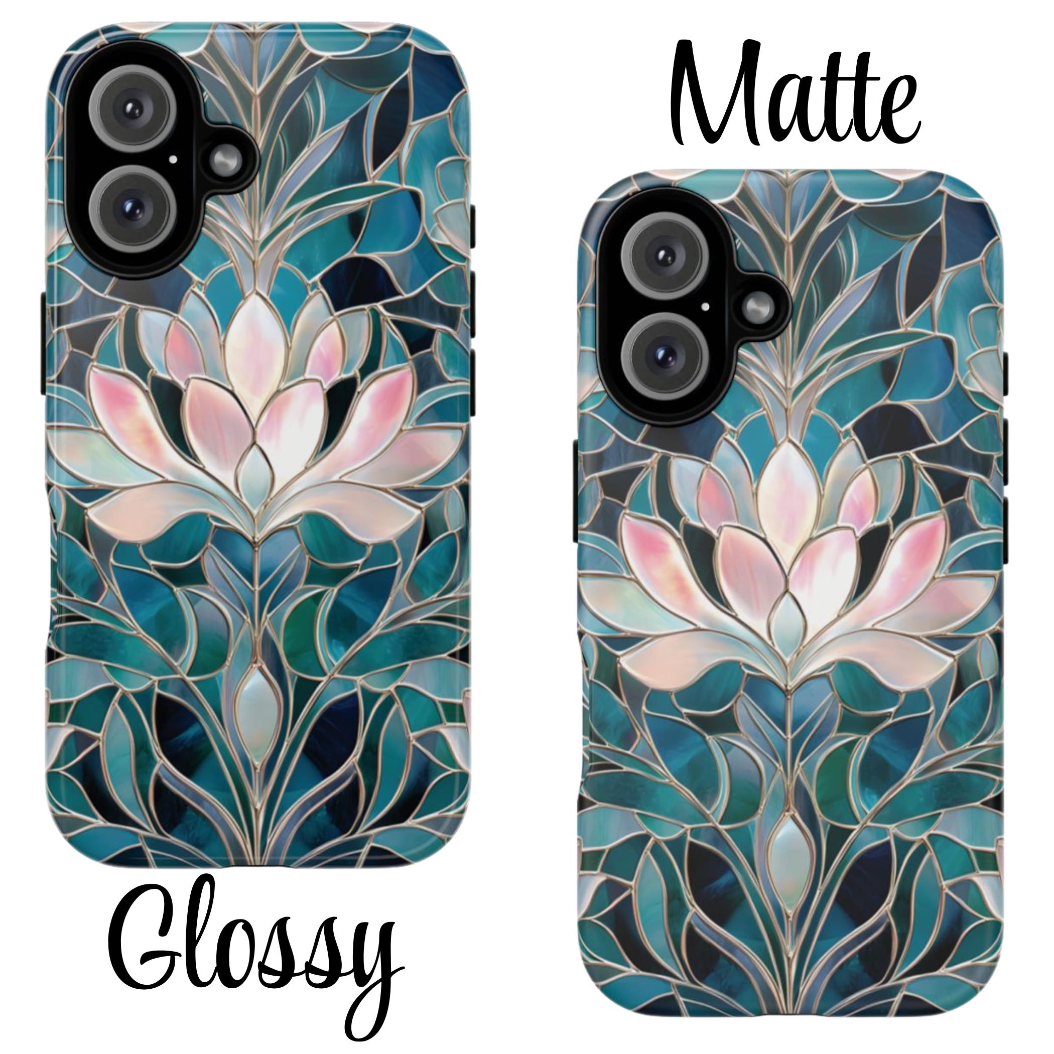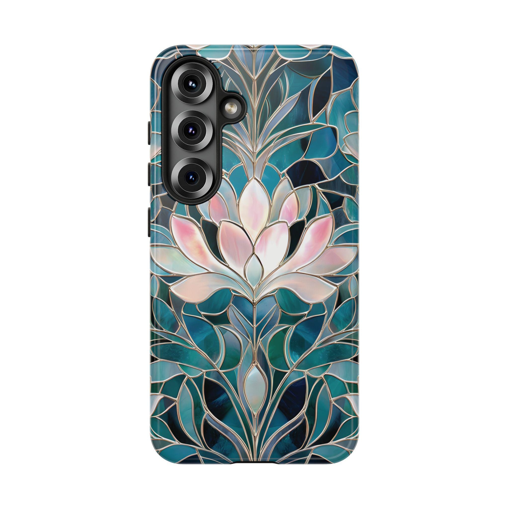 Protect your phone in style with this lotus flower tough phone case. Featuring a stained glass–inspired floral design in teal, blue, and soft pink tones, this case combines beauty and durability. Made with a dual-layer protective shell, it offers strong shock absorption while keeping a slim, comfortable feel.