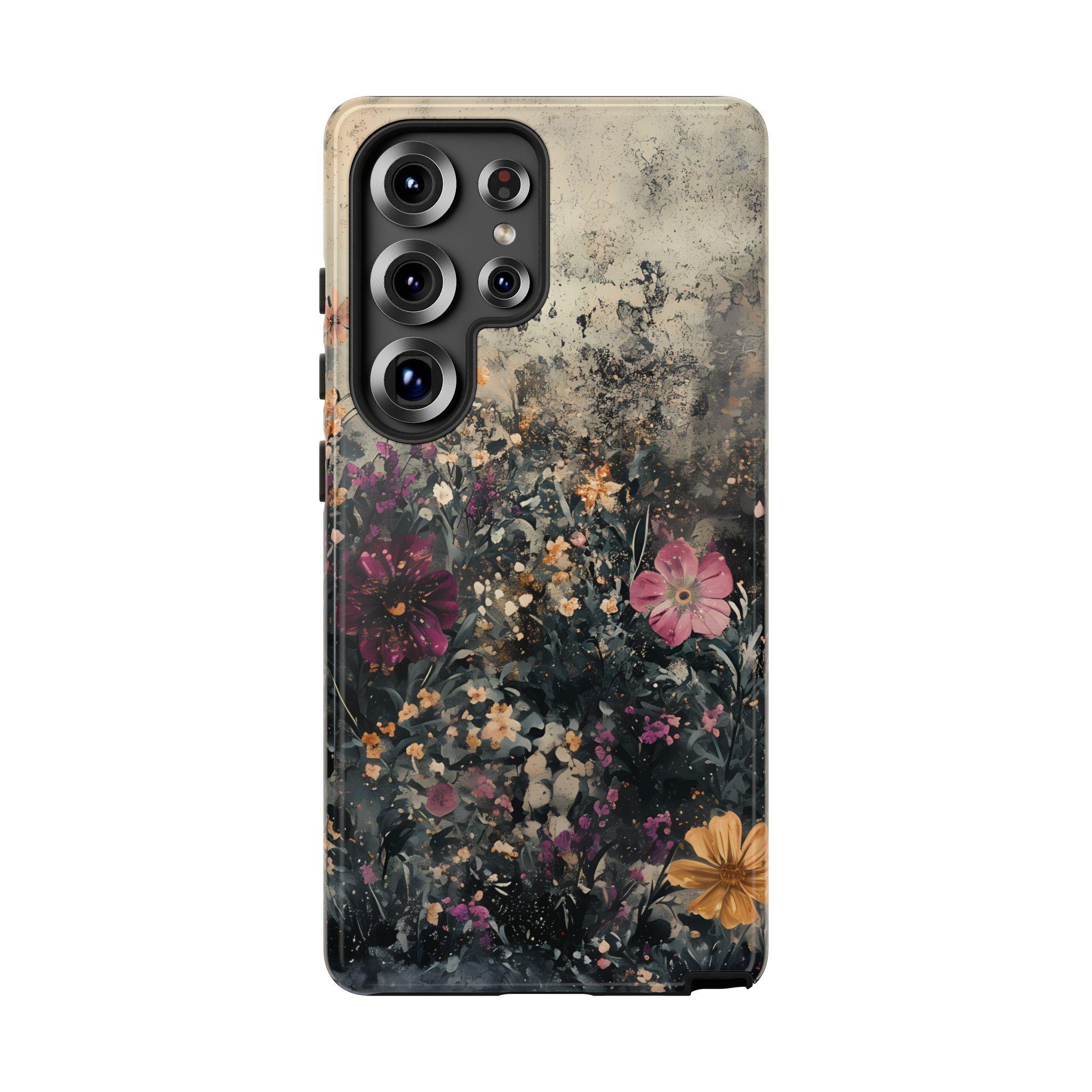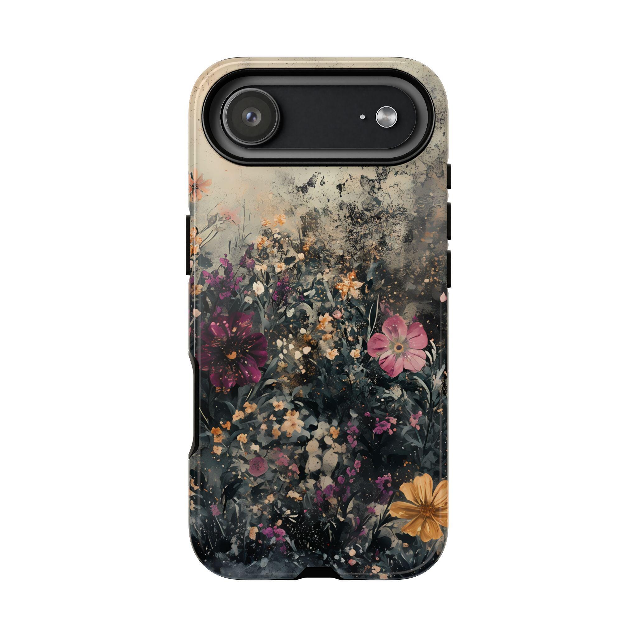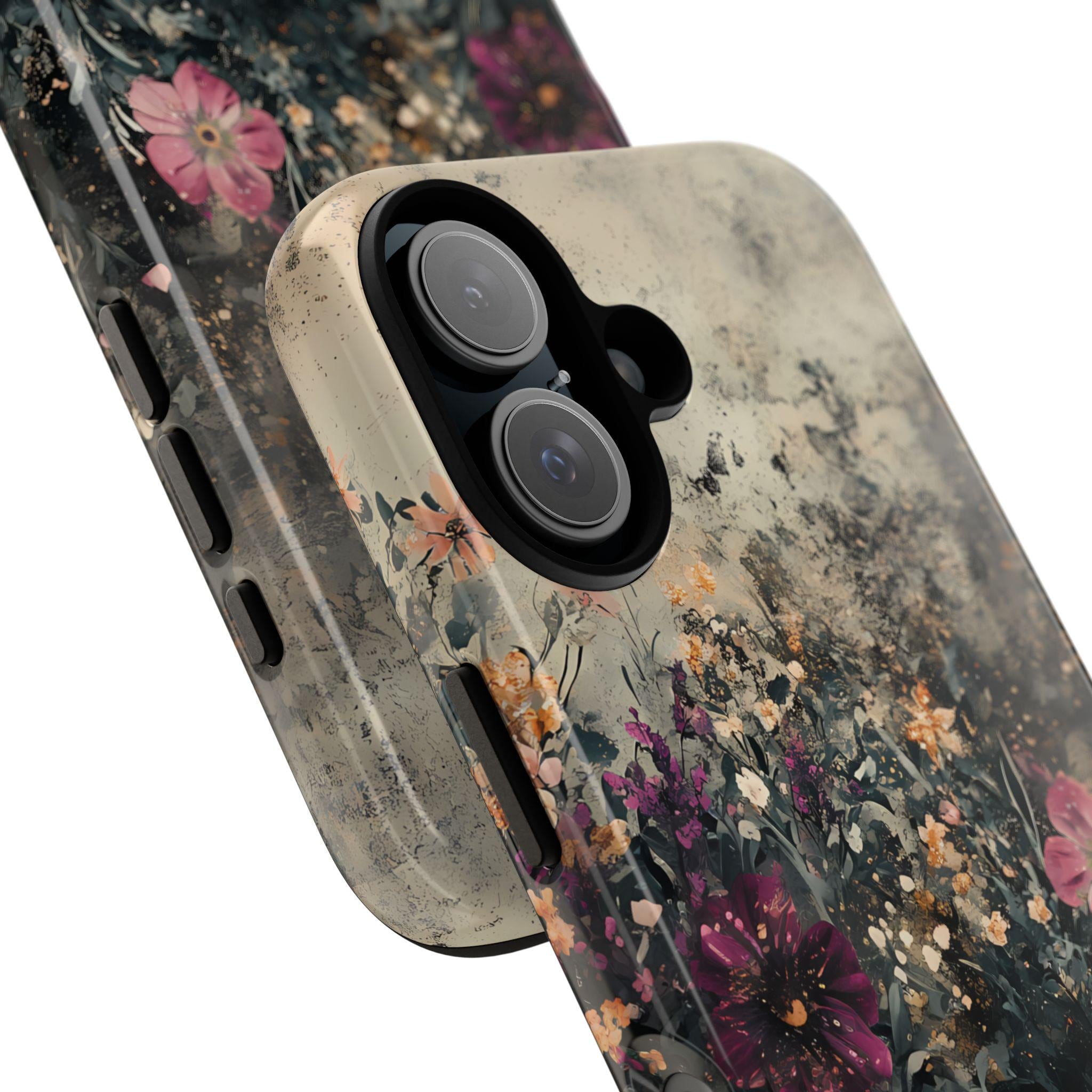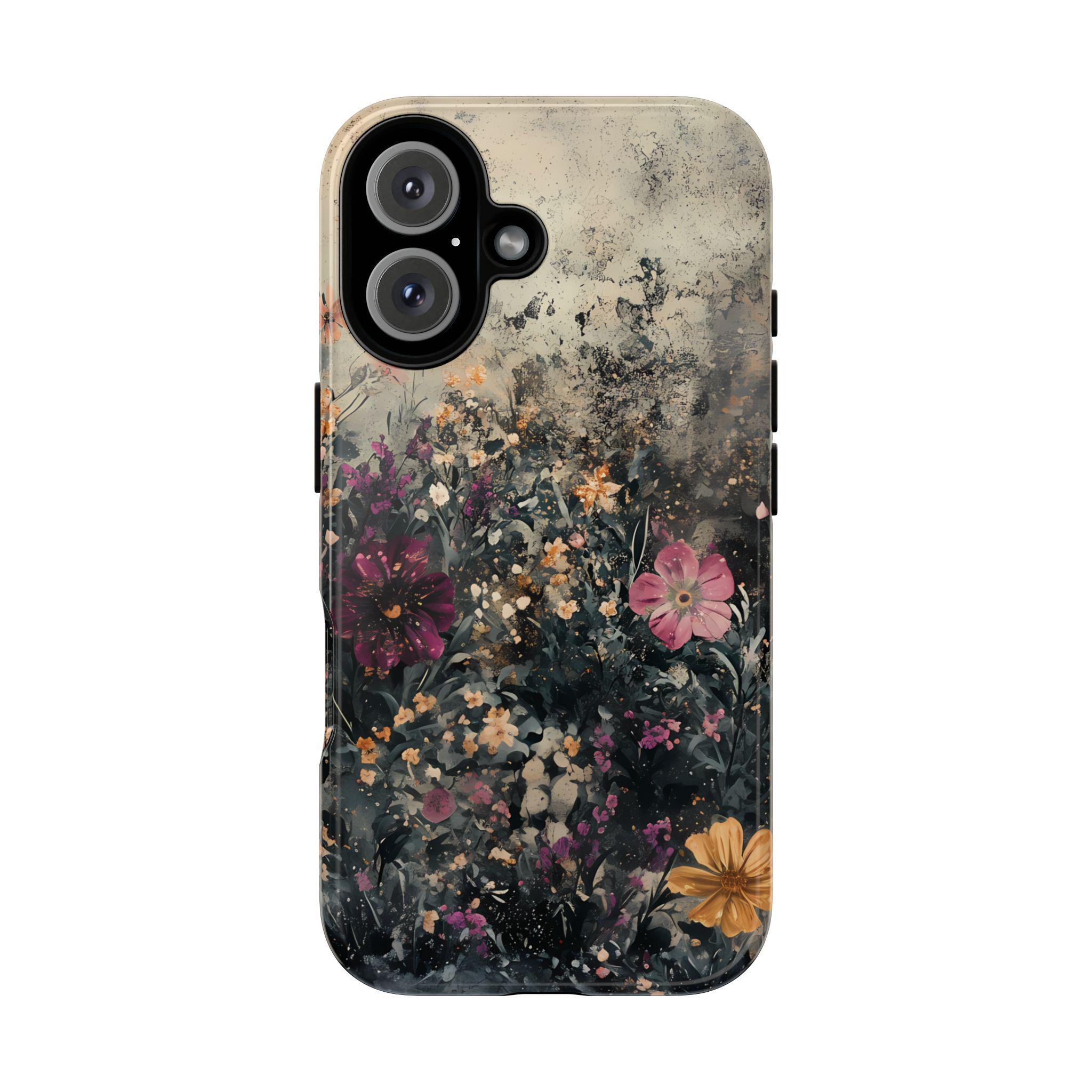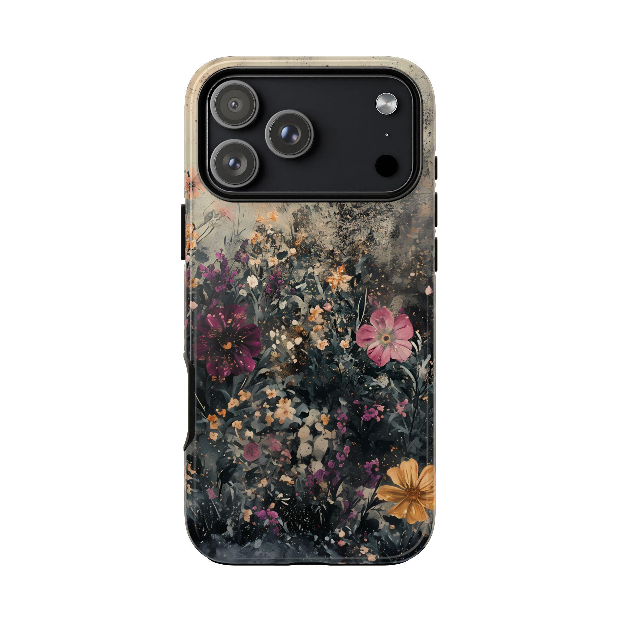 This tough phone case features a richly layered wildflower design set against a vintage, textured backdrop—blending deep navy foliage, soft blush blooms, and warm golden accents for an effortlessly artistic feel. Equal parts romantic and dramatic, it’s perfect for anyone who loves dark cottagecore vibes with a modern edge.