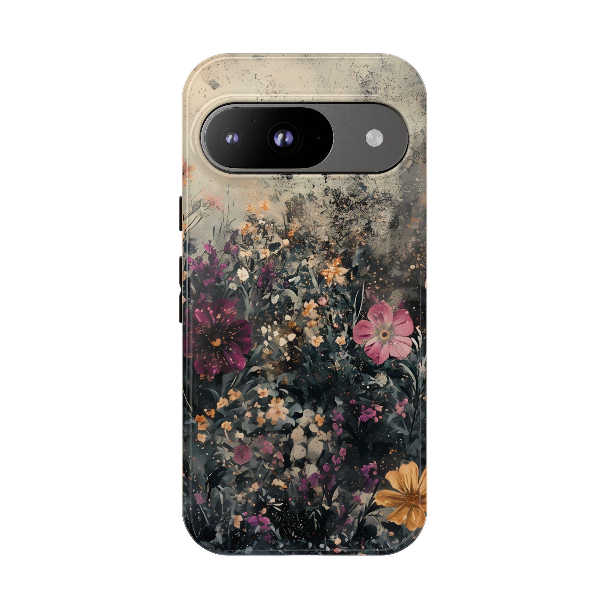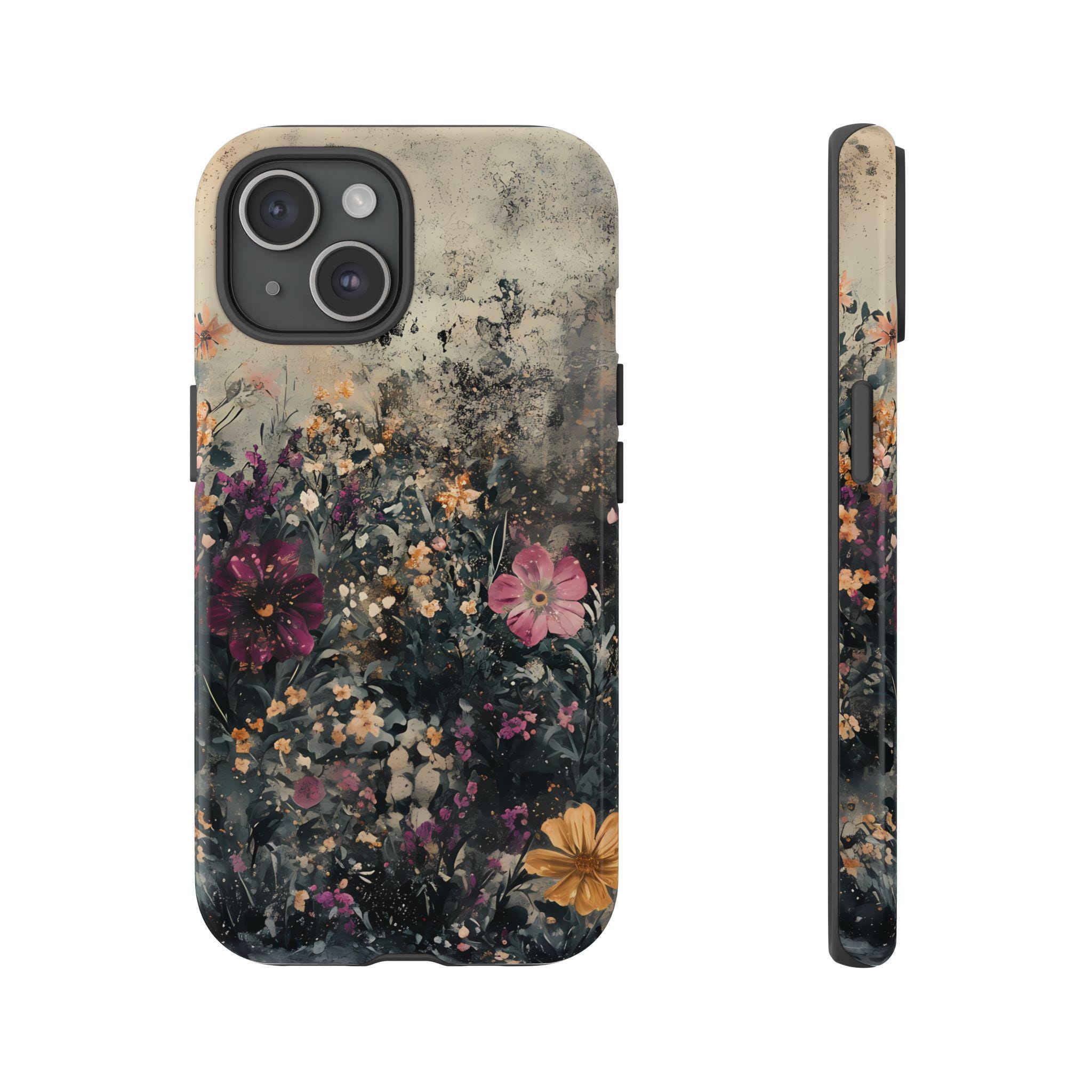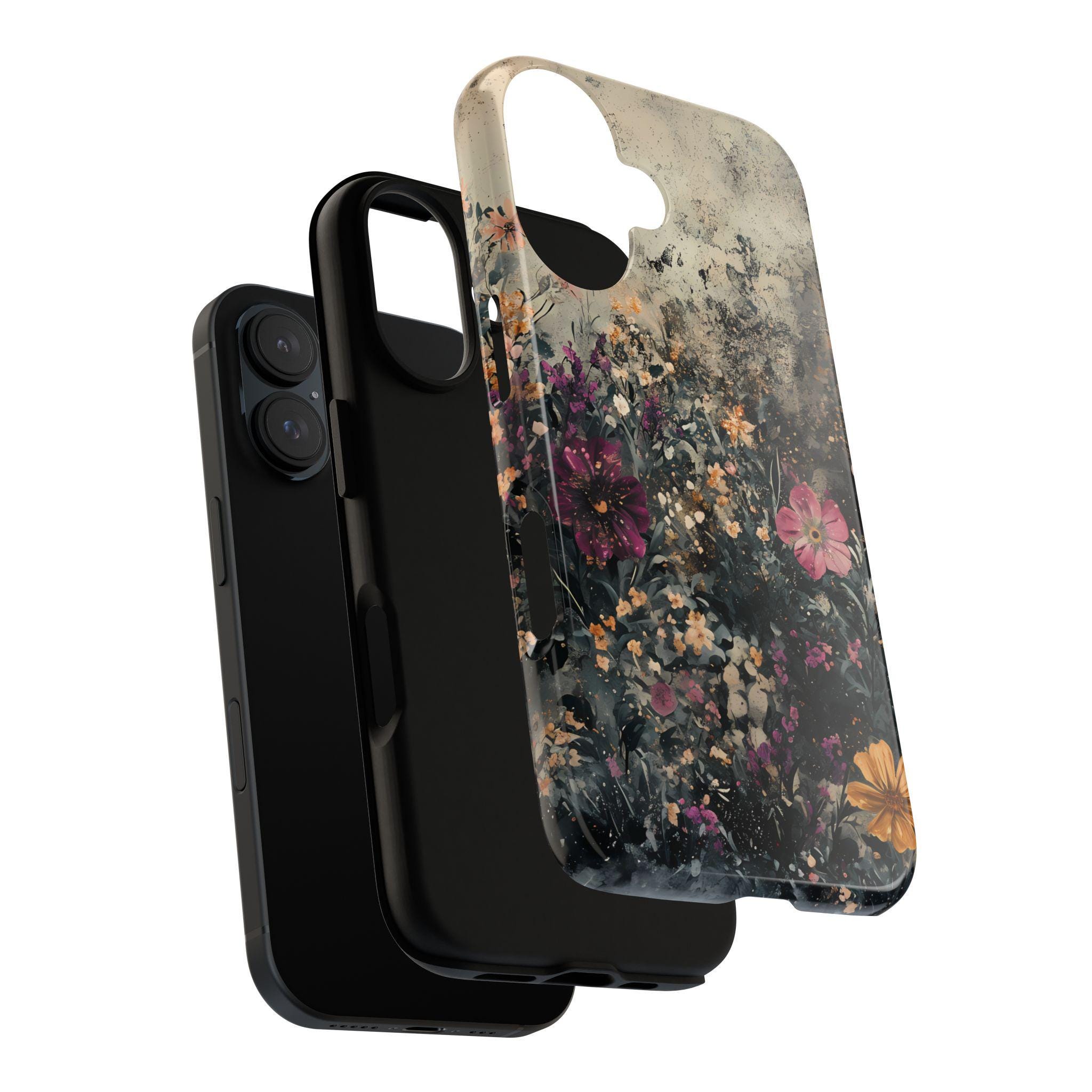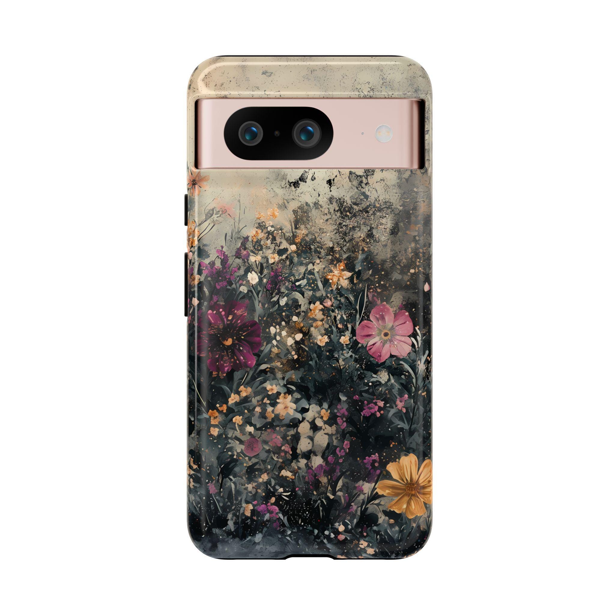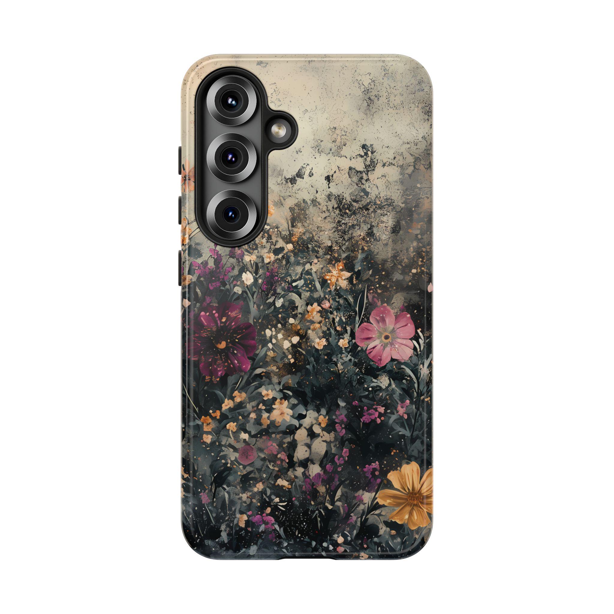 This tough phone case features a richly layered wildflower design set against a vintage, textured backdrop—blending deep navy foliage, soft blush blooms, and warm golden accents for an effortlessly artistic feel. Equal parts romantic and dramatic, it’s perfect for anyone who loves dark cottagecore vibes with a modern edge.