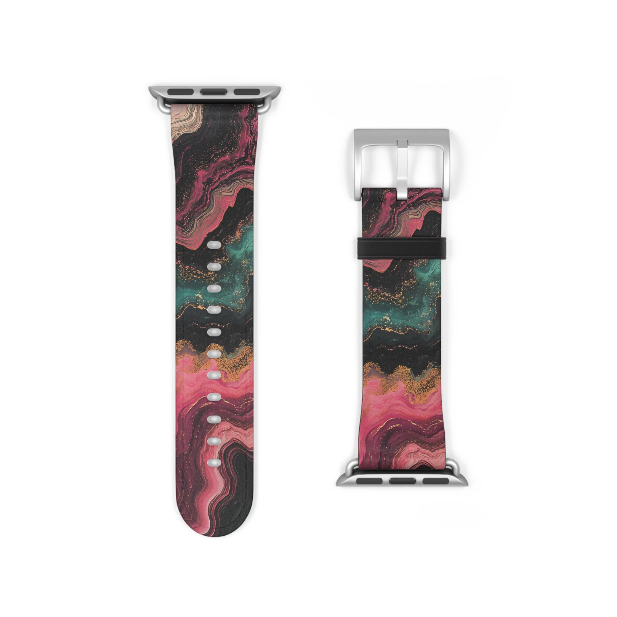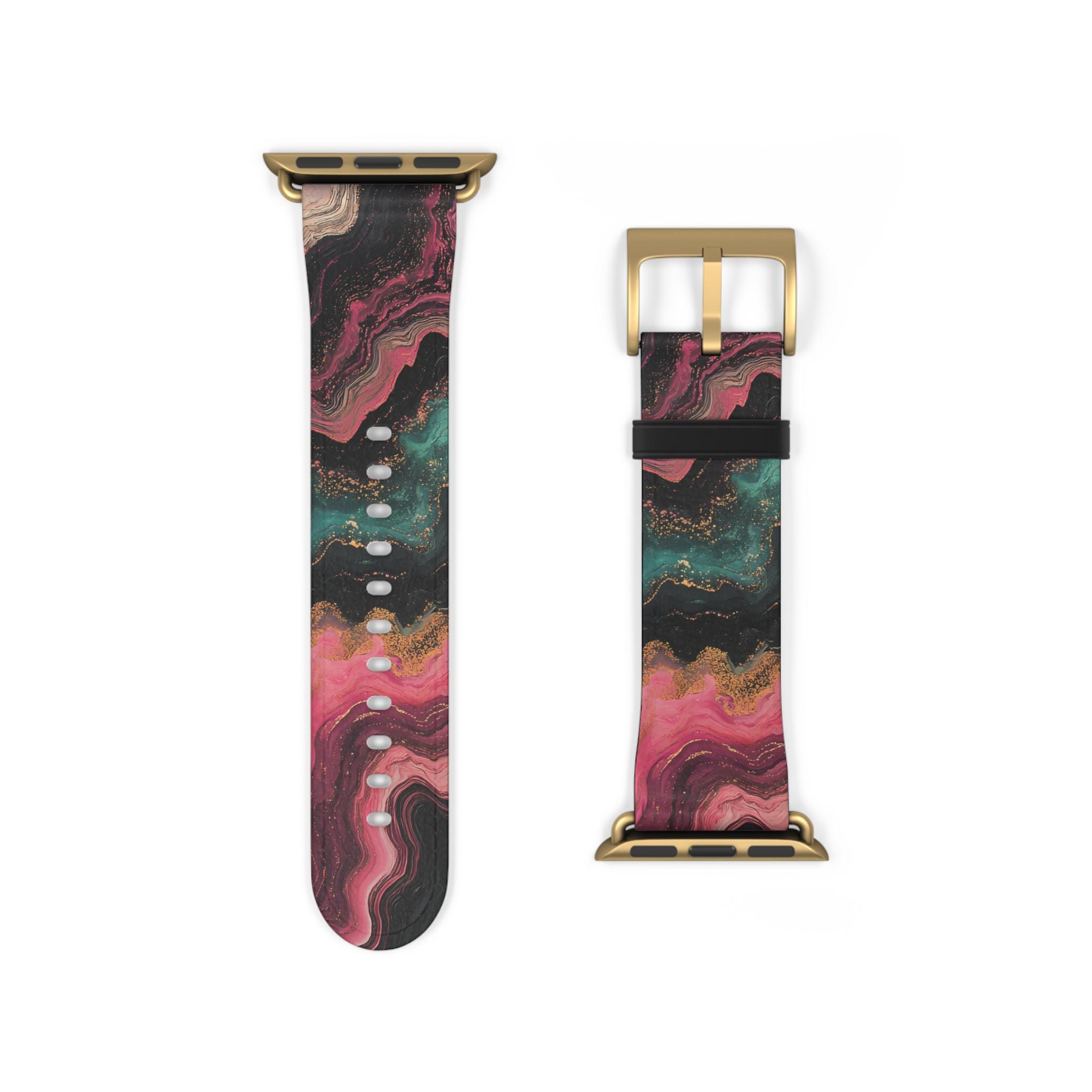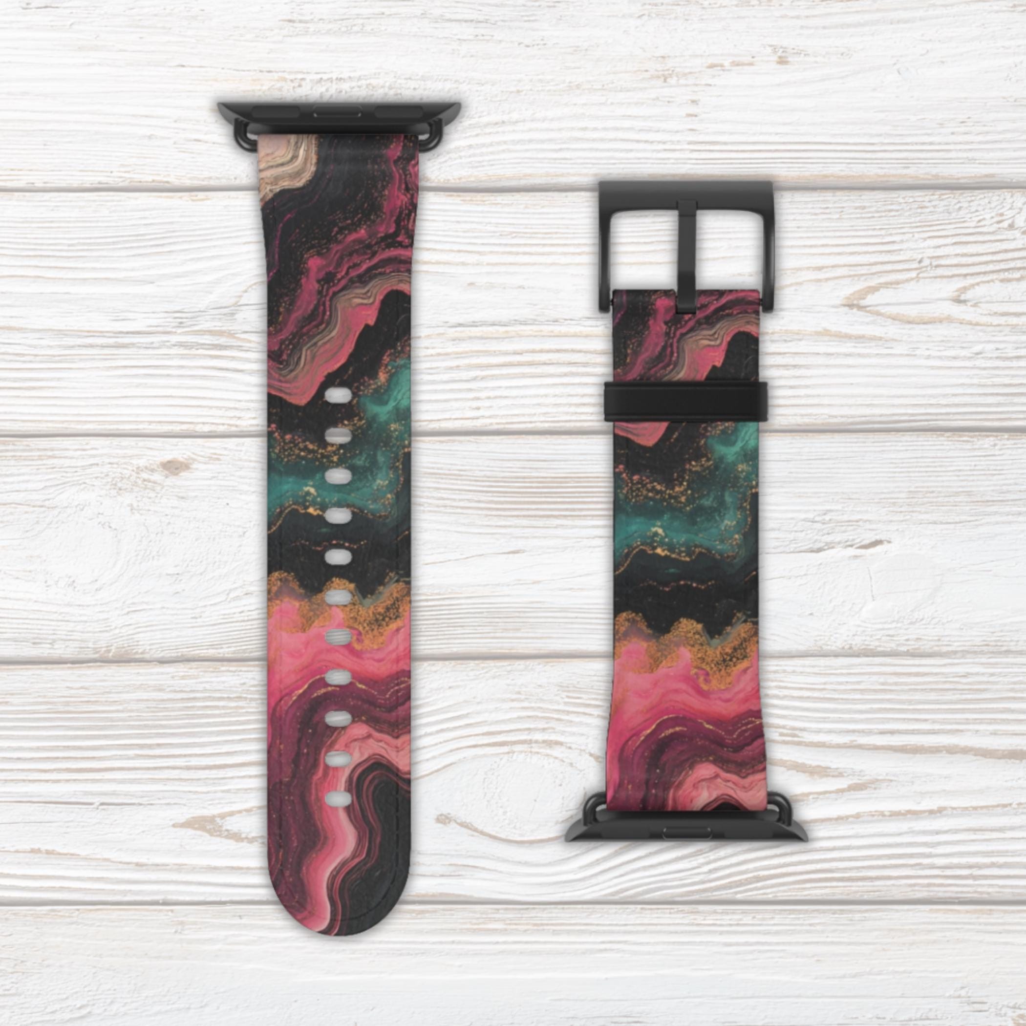 Marbled Watch Band for Apple Watch Series 1 2 3 4 5 6 7 8 9 Ultra SE, Faux Leather, Stainless Steel Hardware, Pink Green Black, Edgy, Trendy