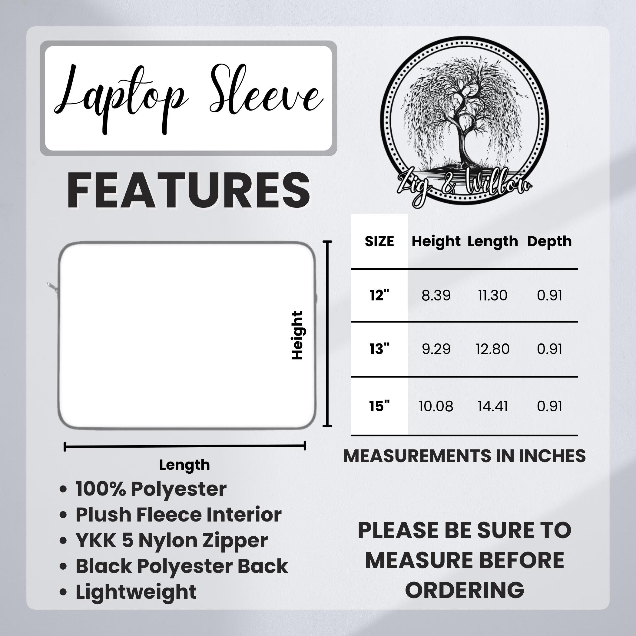 Protect your laptop in style with this Laptop Sleeve. With its lightweight build, this sleeve is not only functional but also adds a flair to your work or study setup. Perfect for students, professionals, or anyone who loves to express their personality through accessories. Ideal for birthdays, back-to-school gifts, or holiday presents.