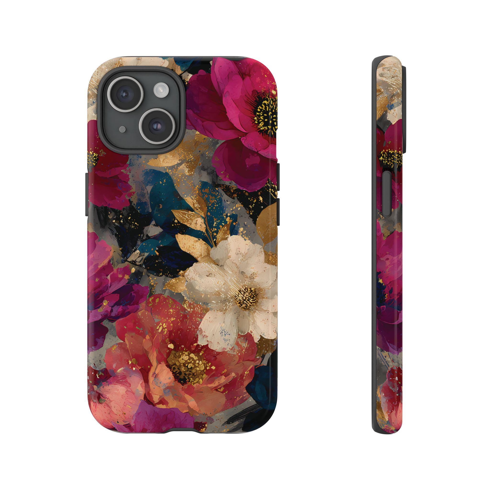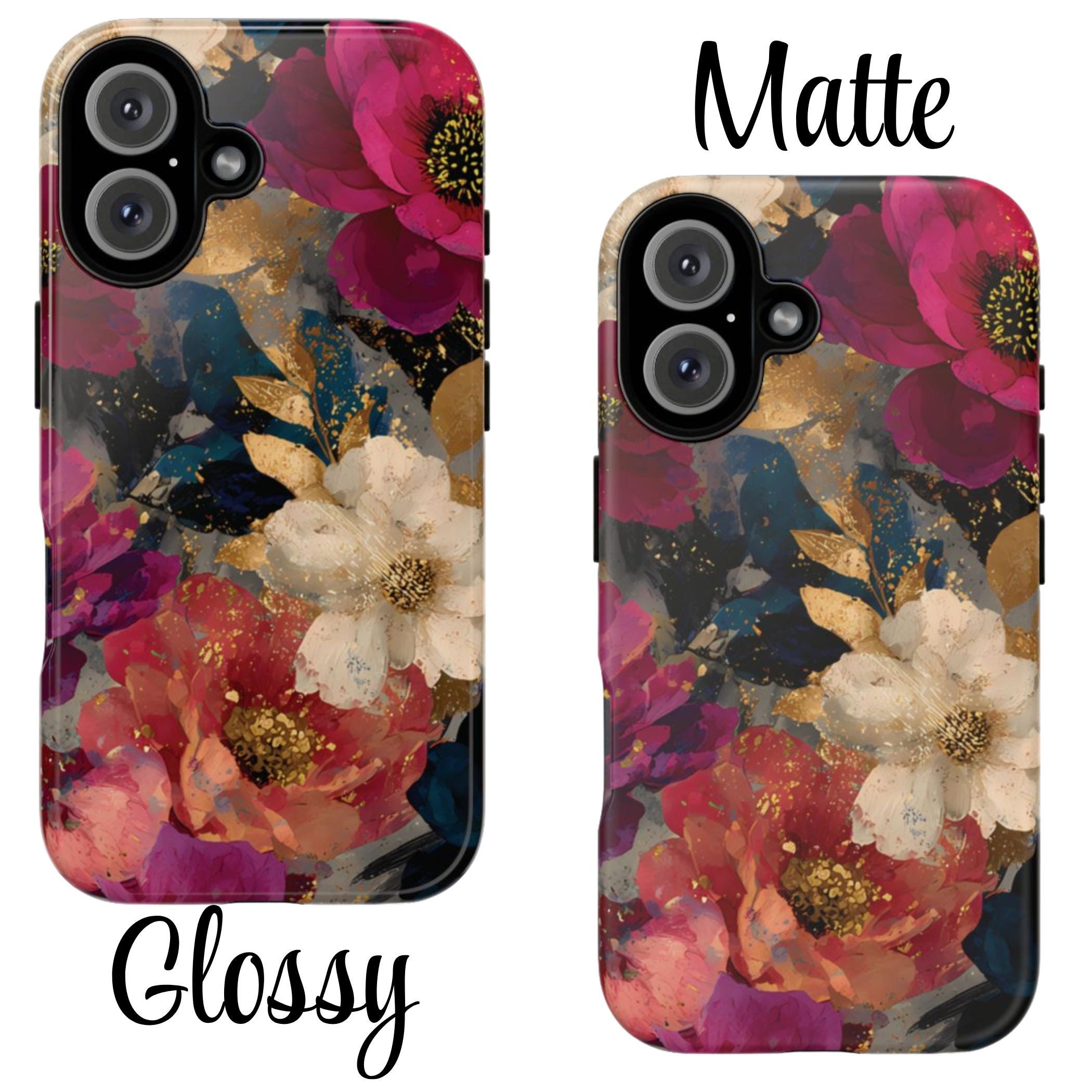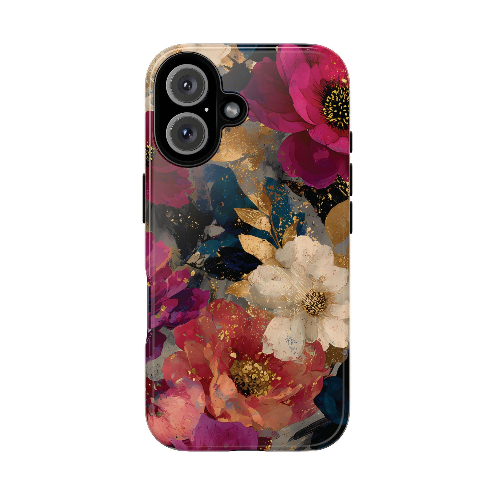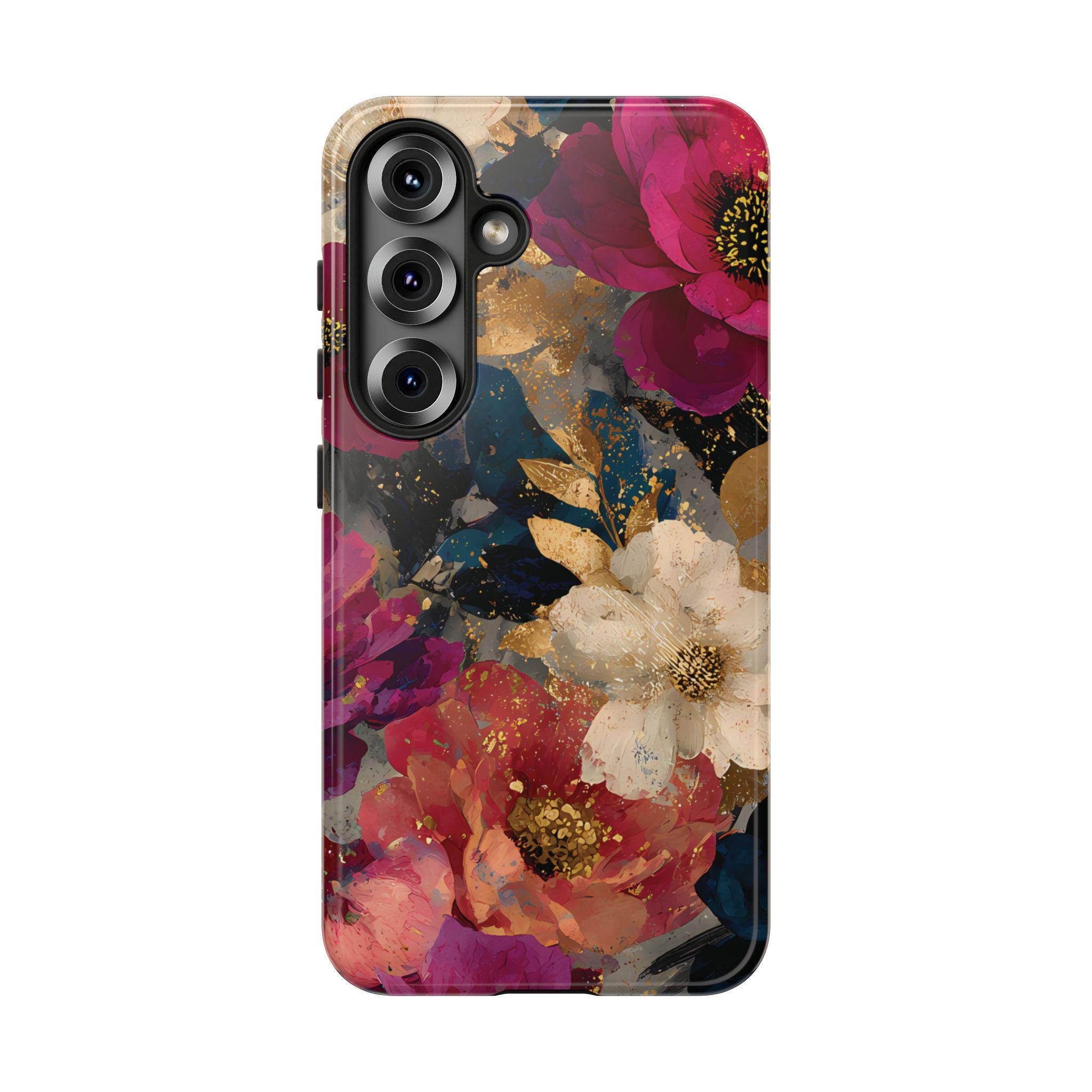 Protect your phone in style with this floral tough phone case featuring a bold vintage-inspired flower design with rich colors and gold accents. This protective phone case is perfect for everyday use, offering durable protection while adding a stylish, artistic look to your phone.