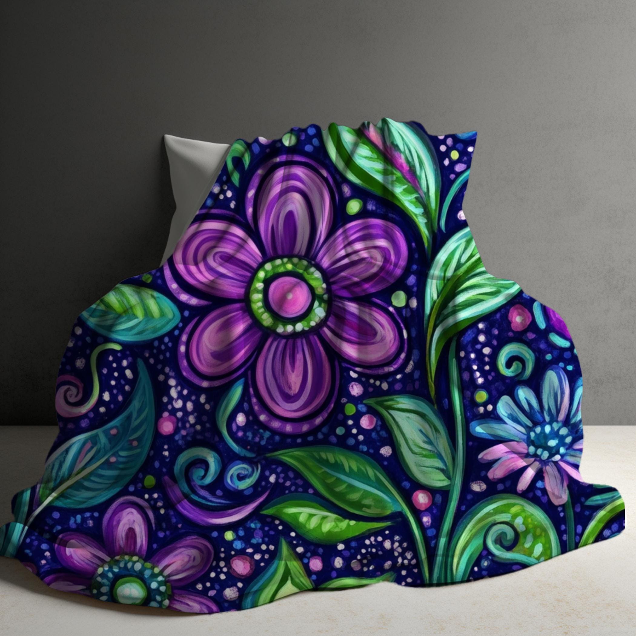 Flower Sherpa Blanket, Floral Fleece Blanket, Throw Blanket, Bedding, Gift Idea, Purple Green Whimsy Fun Vibrant Girly 50x60, 60x80