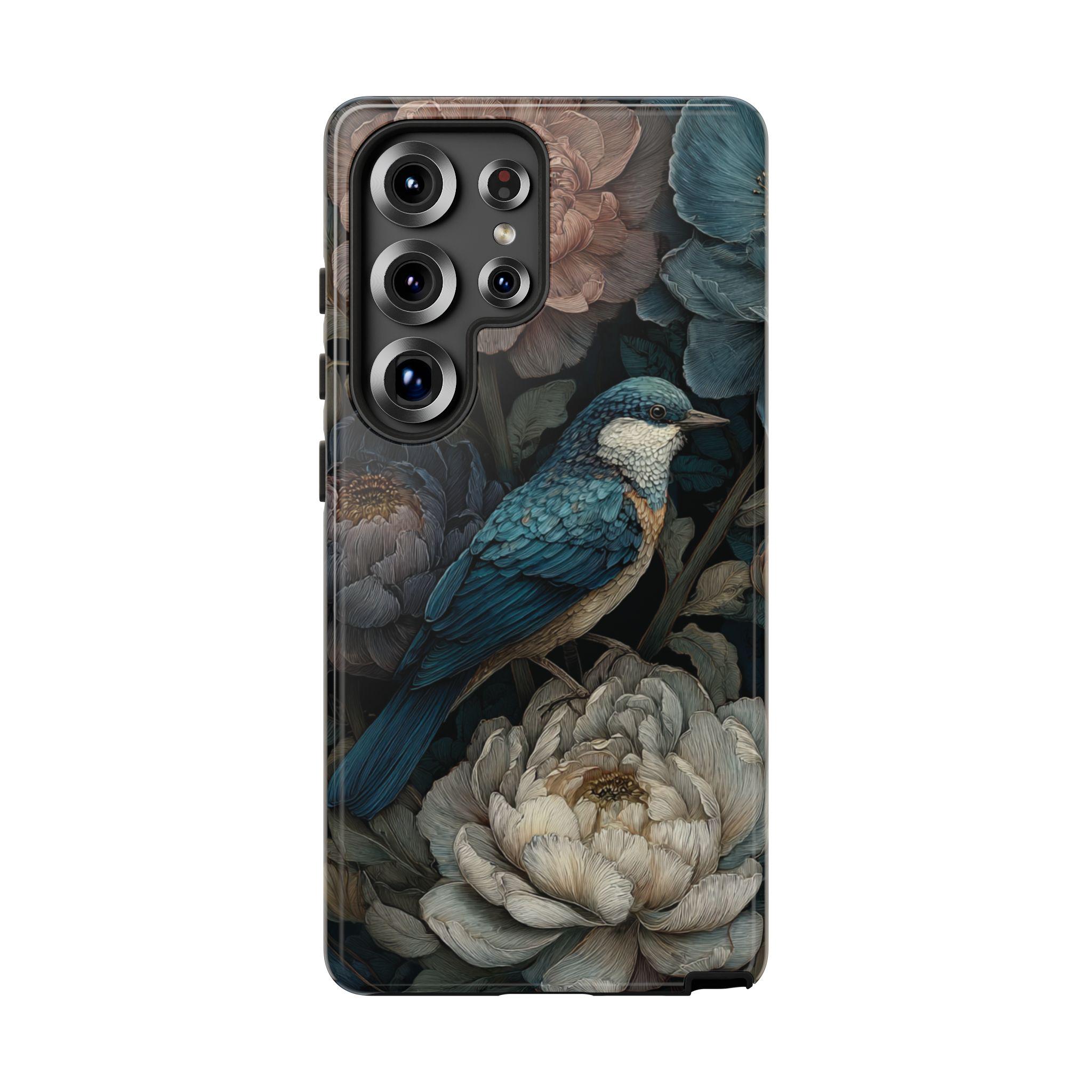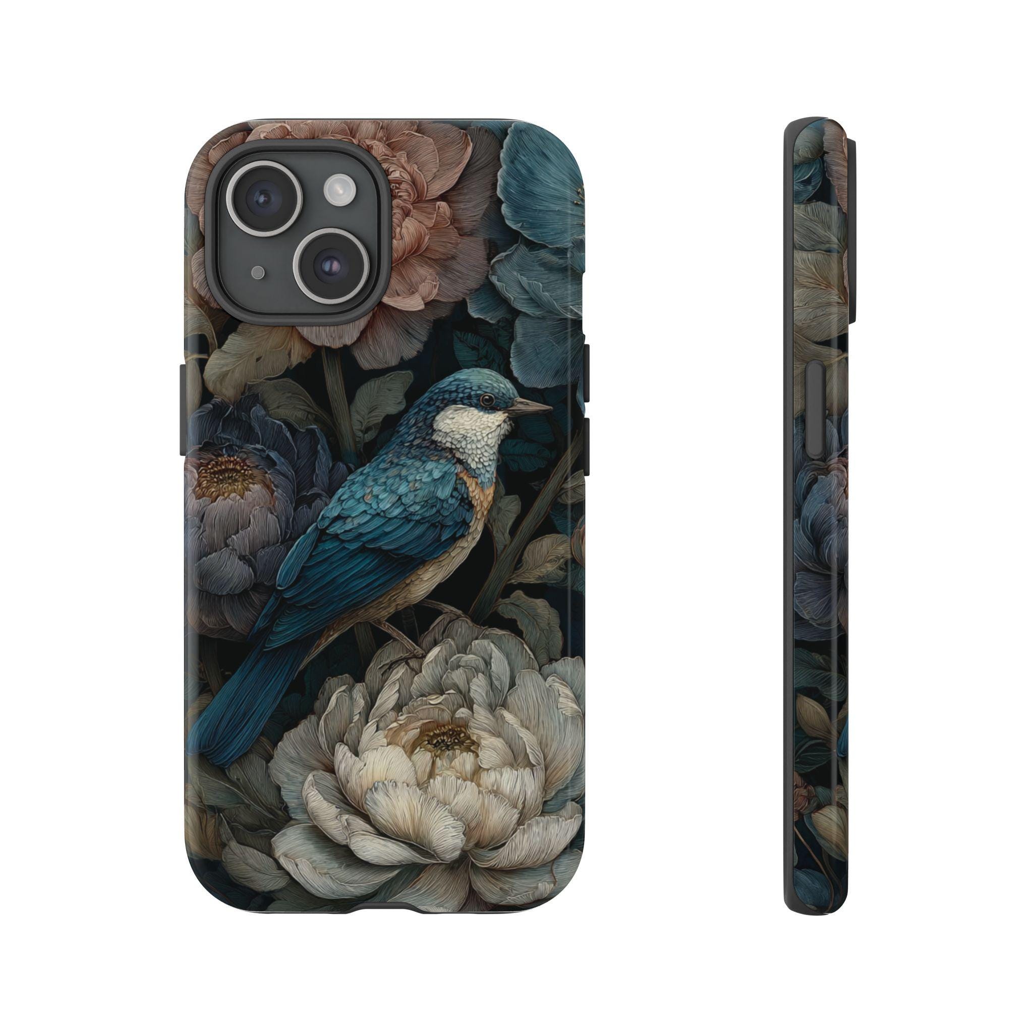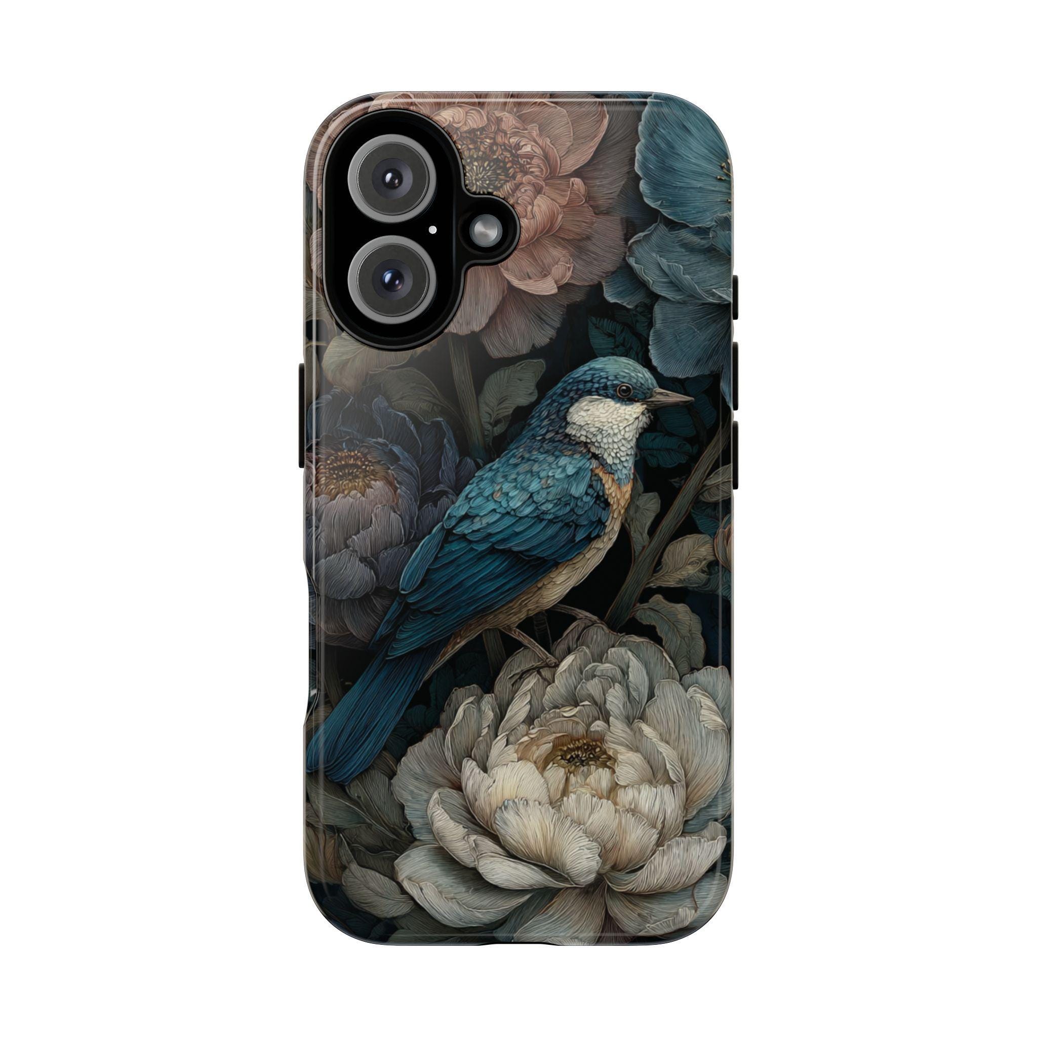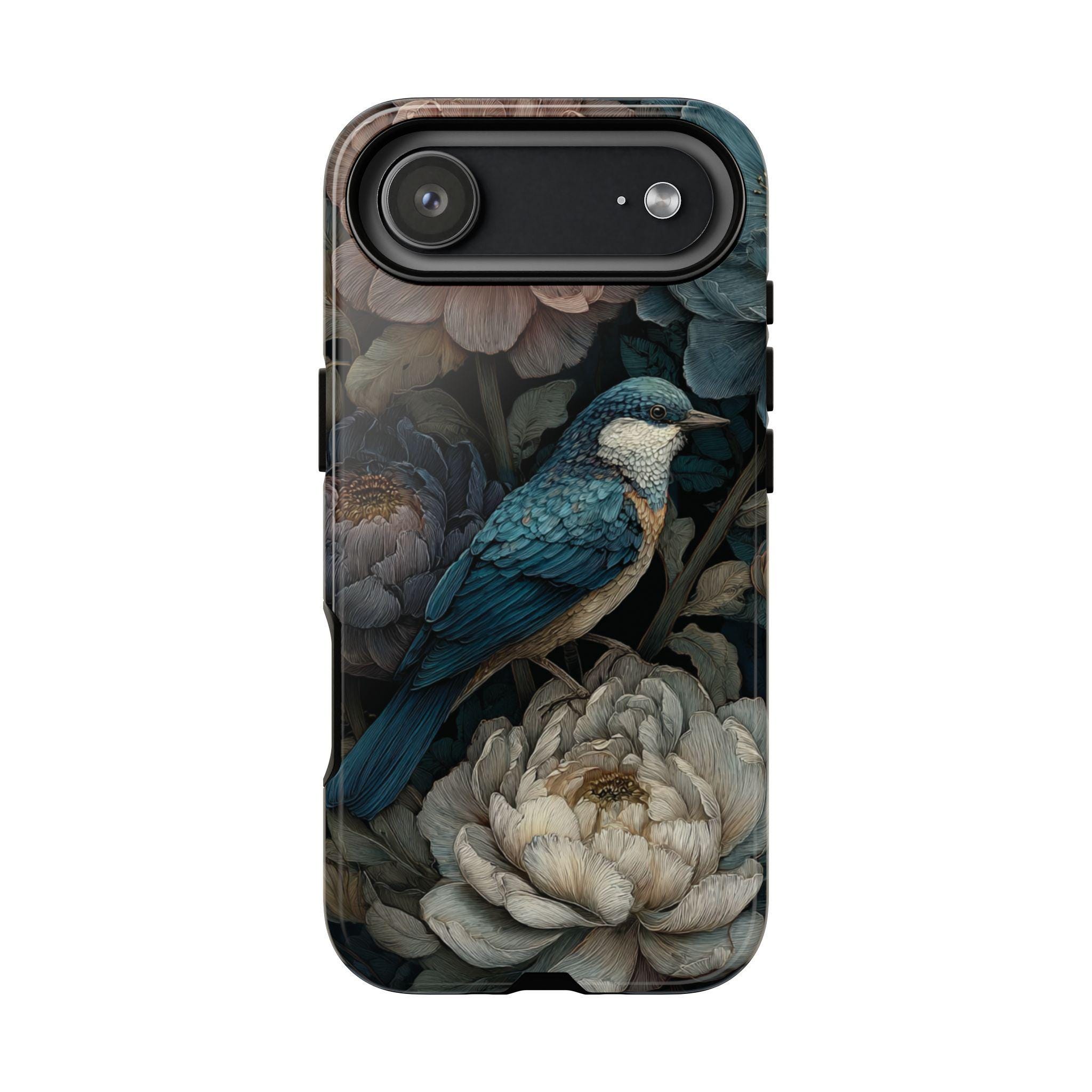 Protect your phone with timeless botanical beauty. This tough phone case features an elegant blue songbird surrounded by richly detailed florals in deep, moody tones. Inspired by vintage botanical art, it combines artistic style with durable protection—perfect for nature lovers, boho aesthetics, and anyone who wants their phone case to feel like a small work of art.