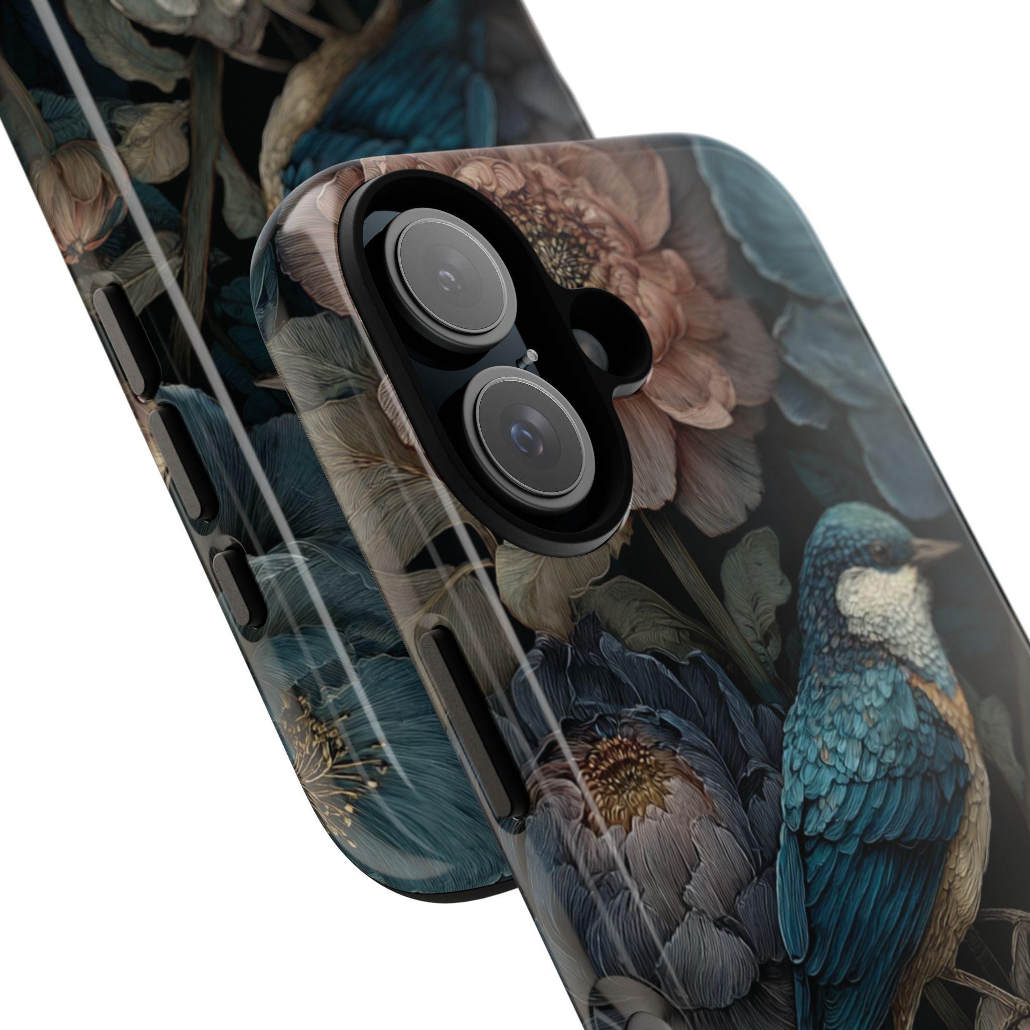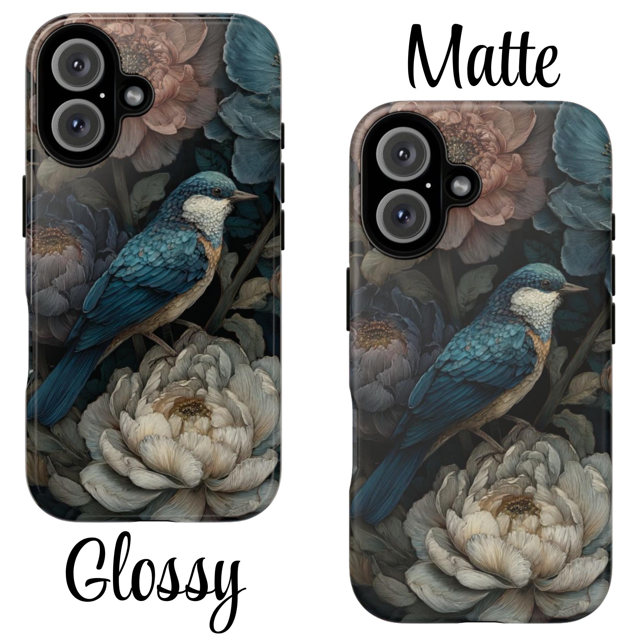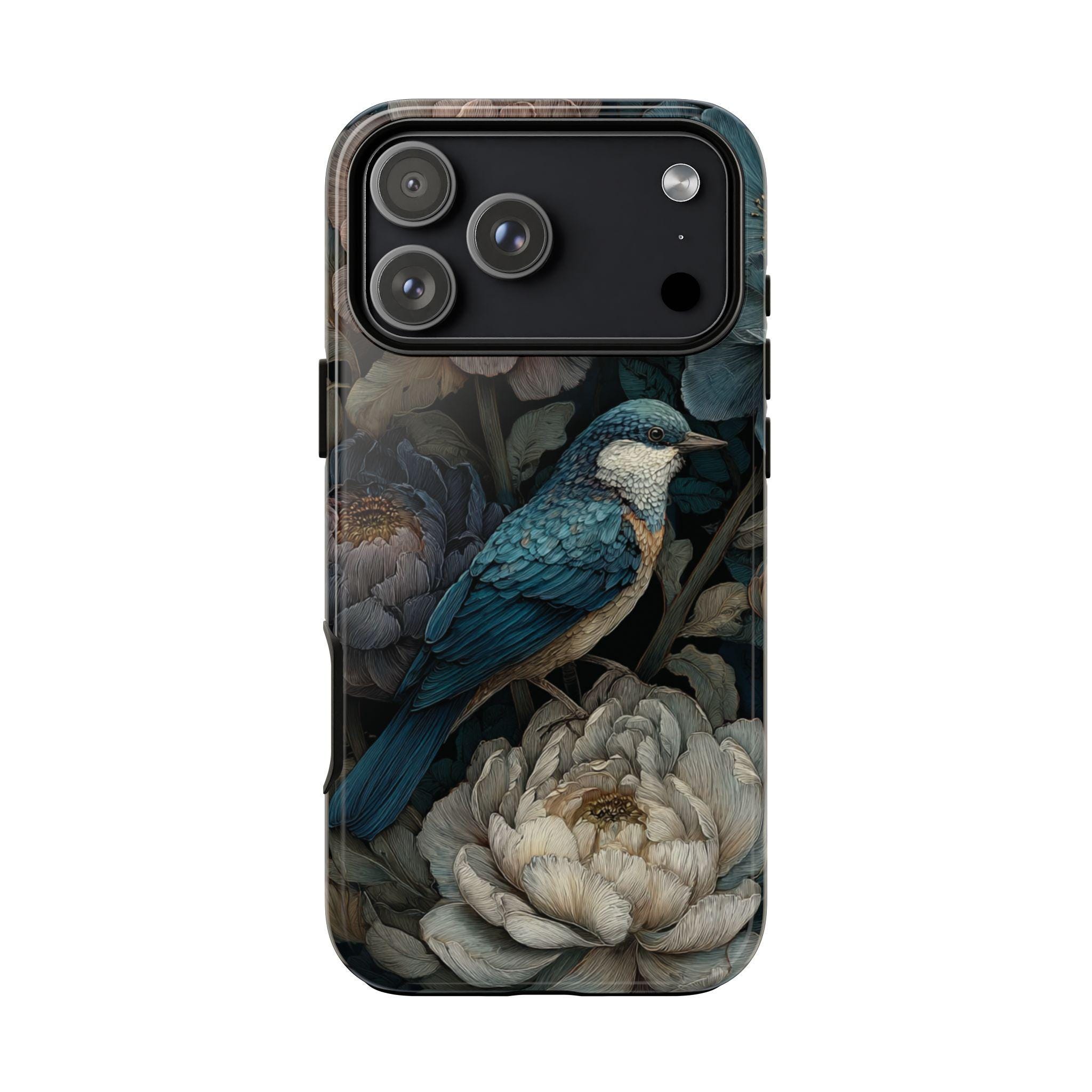 Protect your phone with timeless botanical beauty. This tough phone case features an elegant blue songbird surrounded by richly detailed florals in deep, moody tones. Inspired by vintage botanical art, it combines artistic style with durable protection—perfect for nature lovers, boho aesthetics, and anyone who wants their phone case to feel like a small work of art.