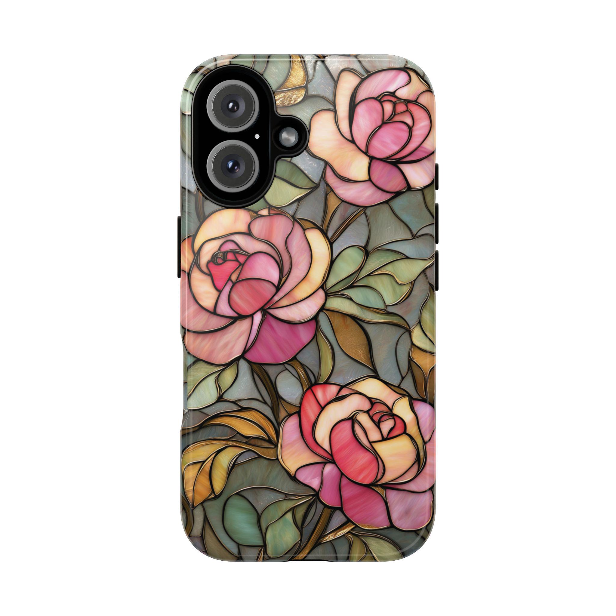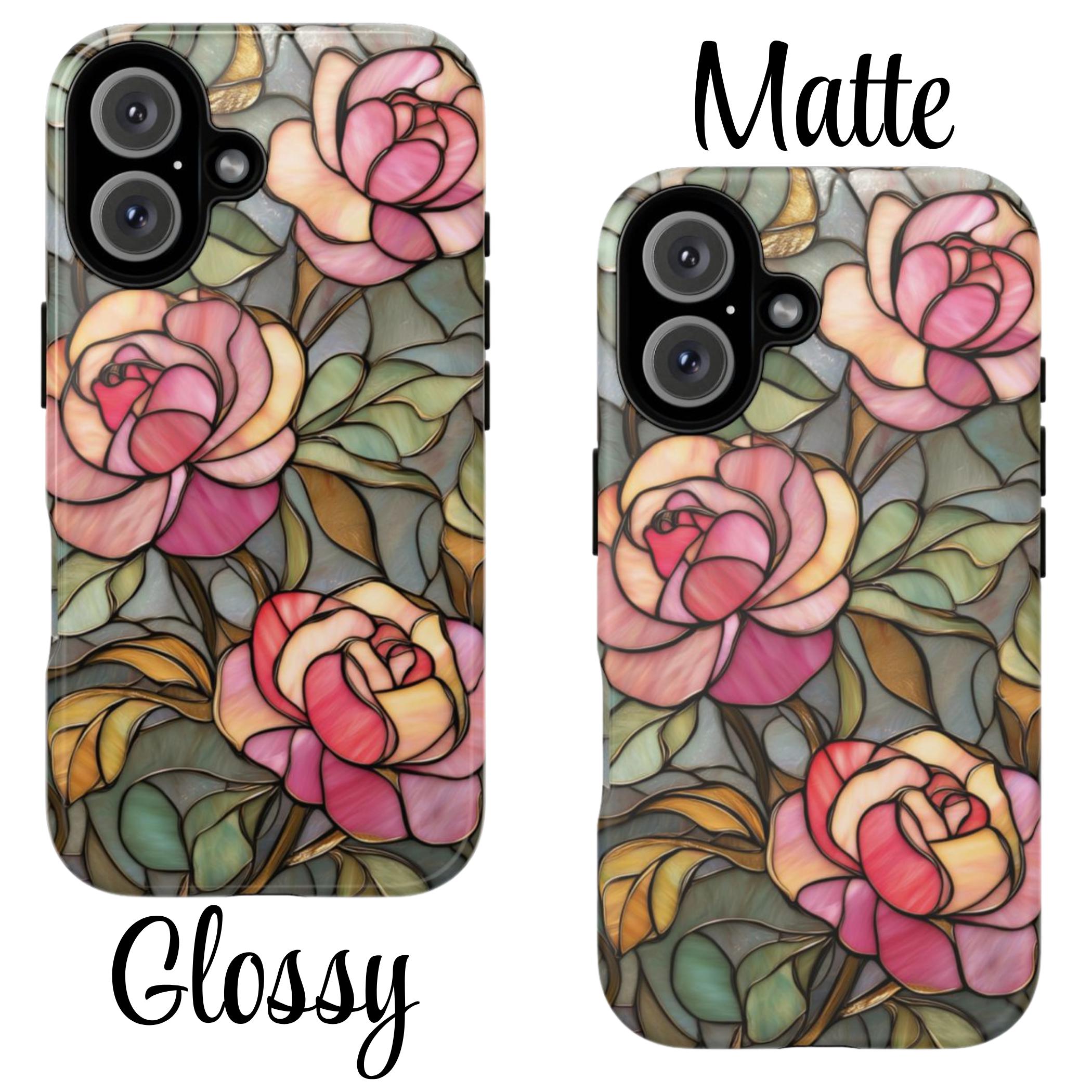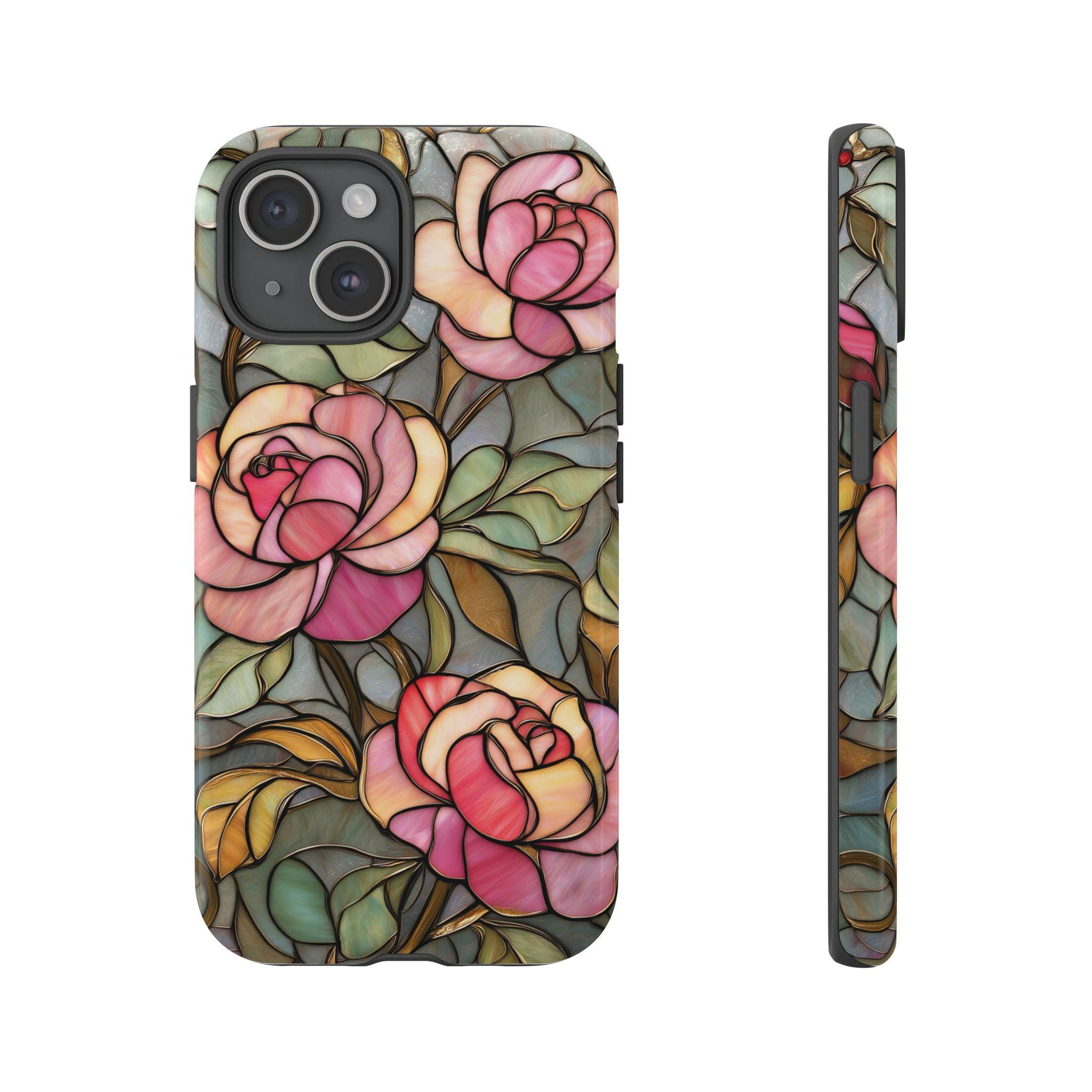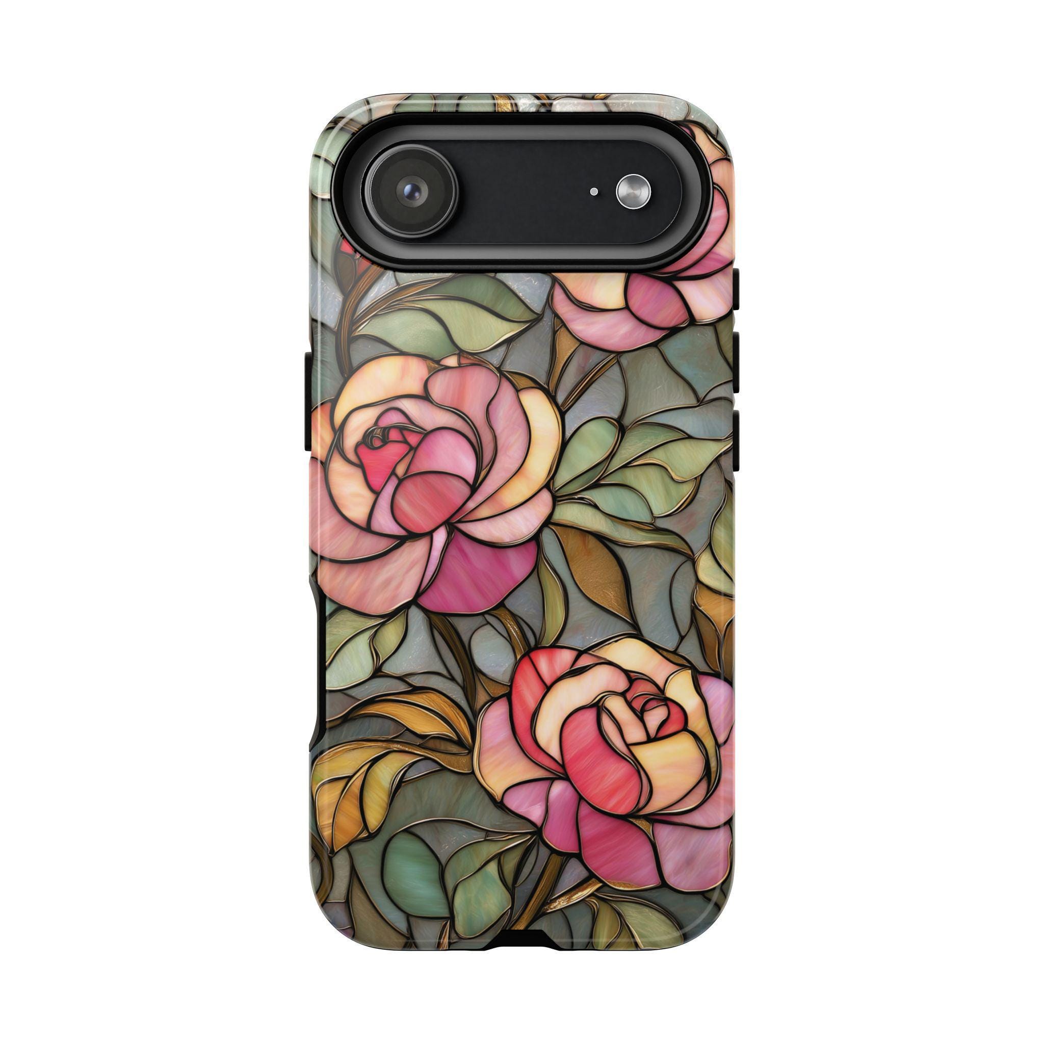 Protect your phone in style with this beautiful stained glass rose tough phone case. Featuring soft pink roses and delicate botanical details inspired by vintage stained glass art, this design adds an elegant, romantic touch to your everyday look. The blend of floral tones and artistic style makes it perfect for anyone who loves feminine, floral, or cottagecore aesthetics. Made for both beauty and durability, this tough case helps protect your phone from everyday drops, bumps, and scratches while keeping your device looking unique and stylish.
