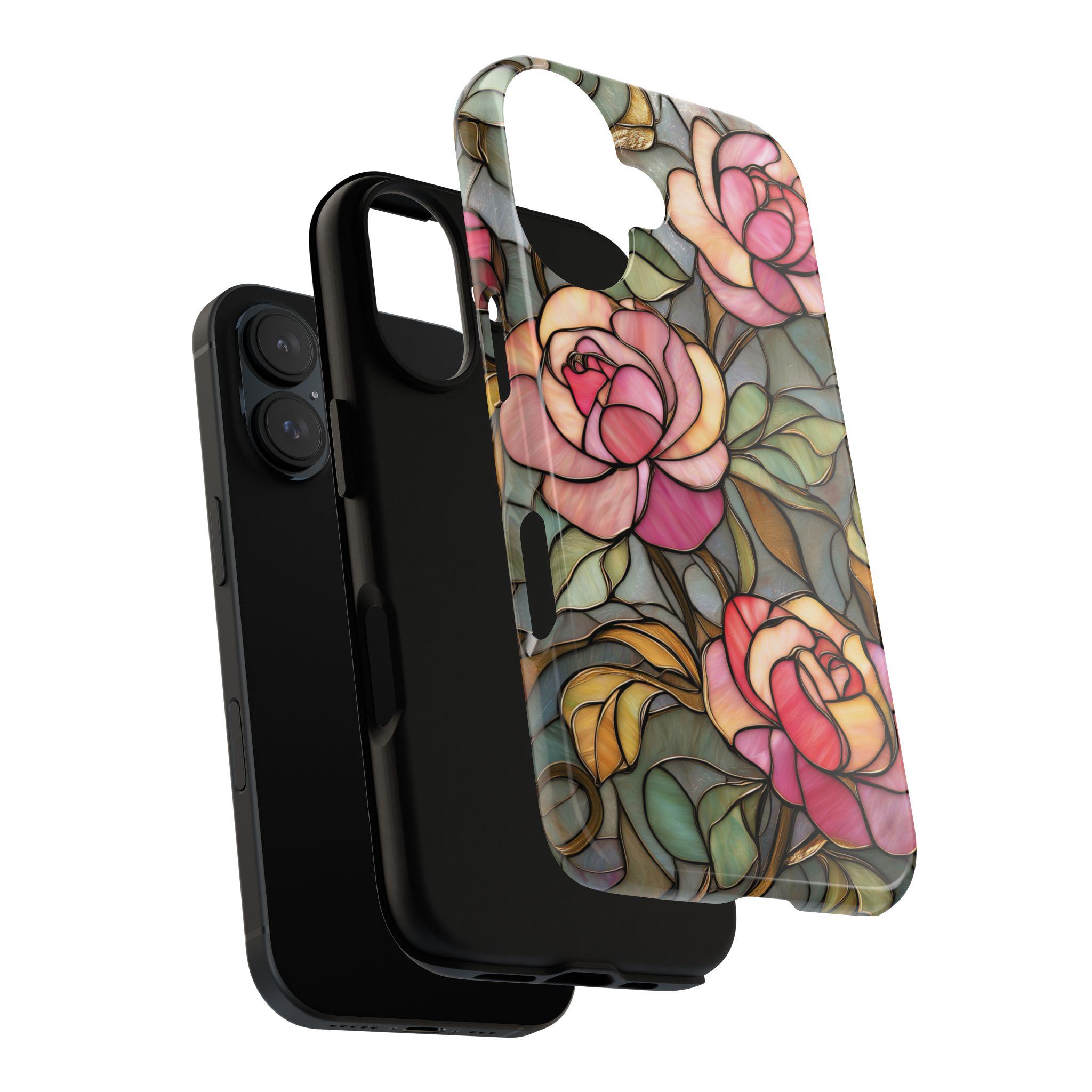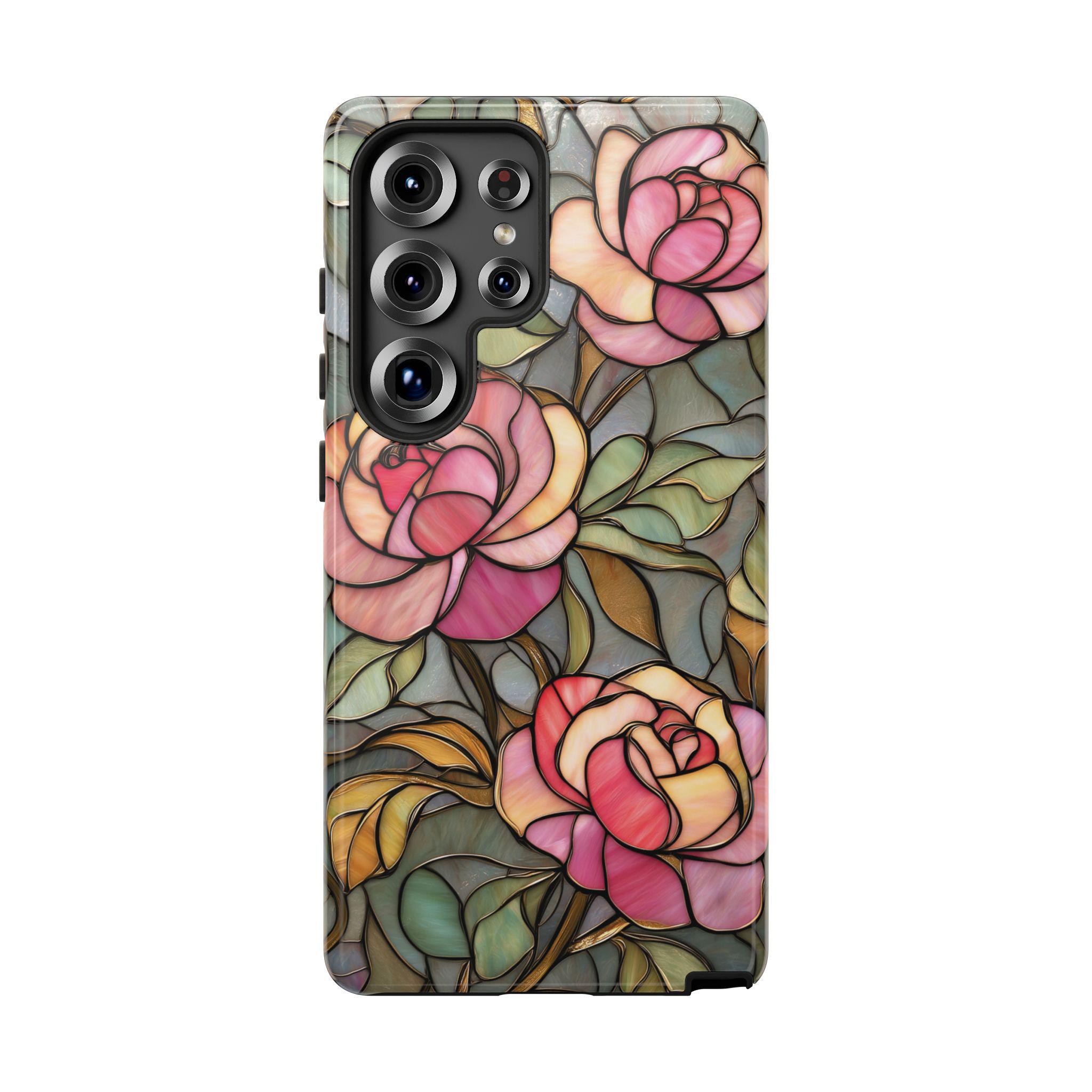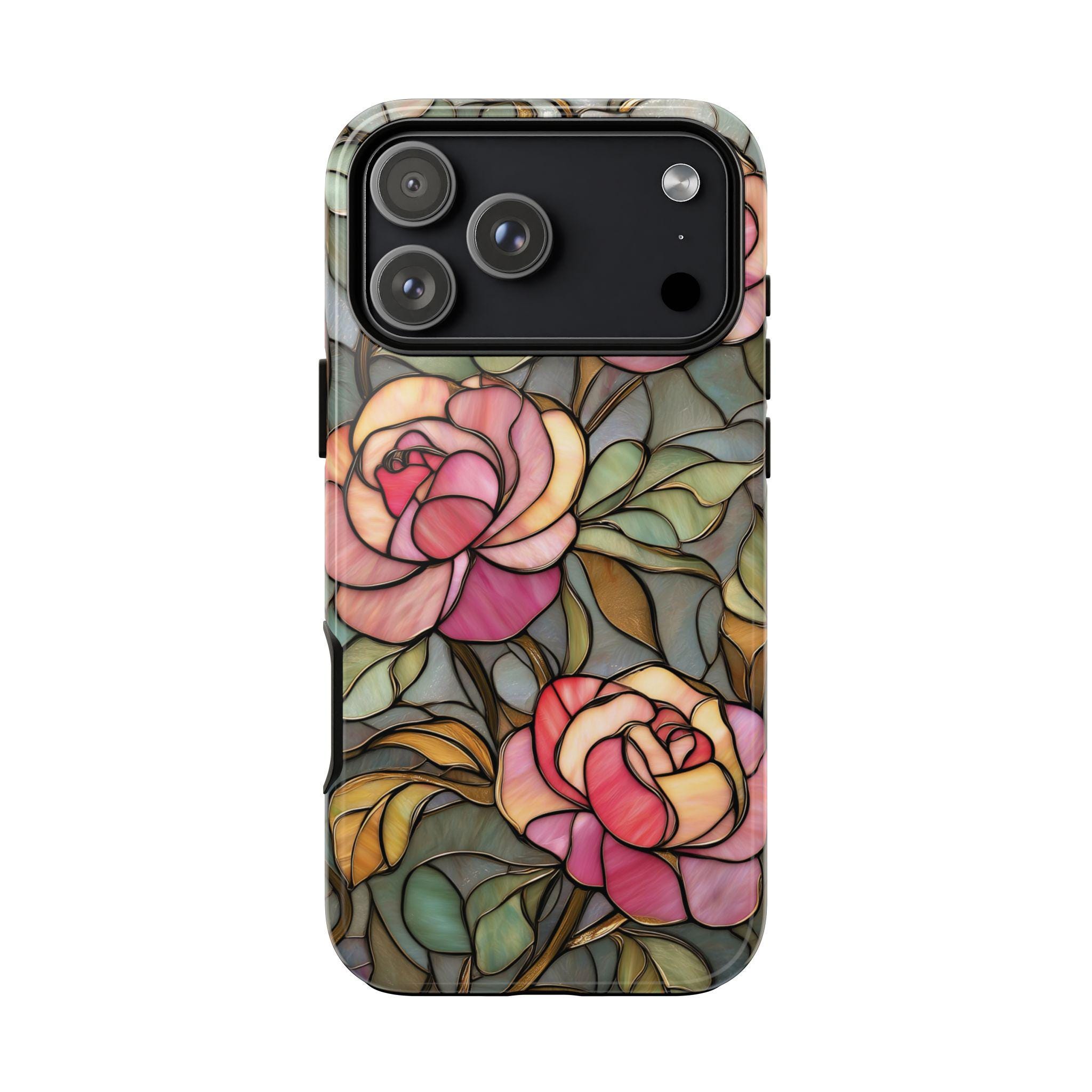 Protect your phone in style with this beautiful stained glass rose tough phone case. Featuring soft pink roses and delicate botanical details inspired by vintage stained glass art, this design adds an elegant, romantic touch to your everyday look. The blend of floral tones and artistic style makes it perfect for anyone who loves feminine, floral, or cottagecore aesthetics. Made for both beauty and durability, this tough case helps protect your phone from everyday drops, bumps, and scratches while keeping your device looking unique and stylish.