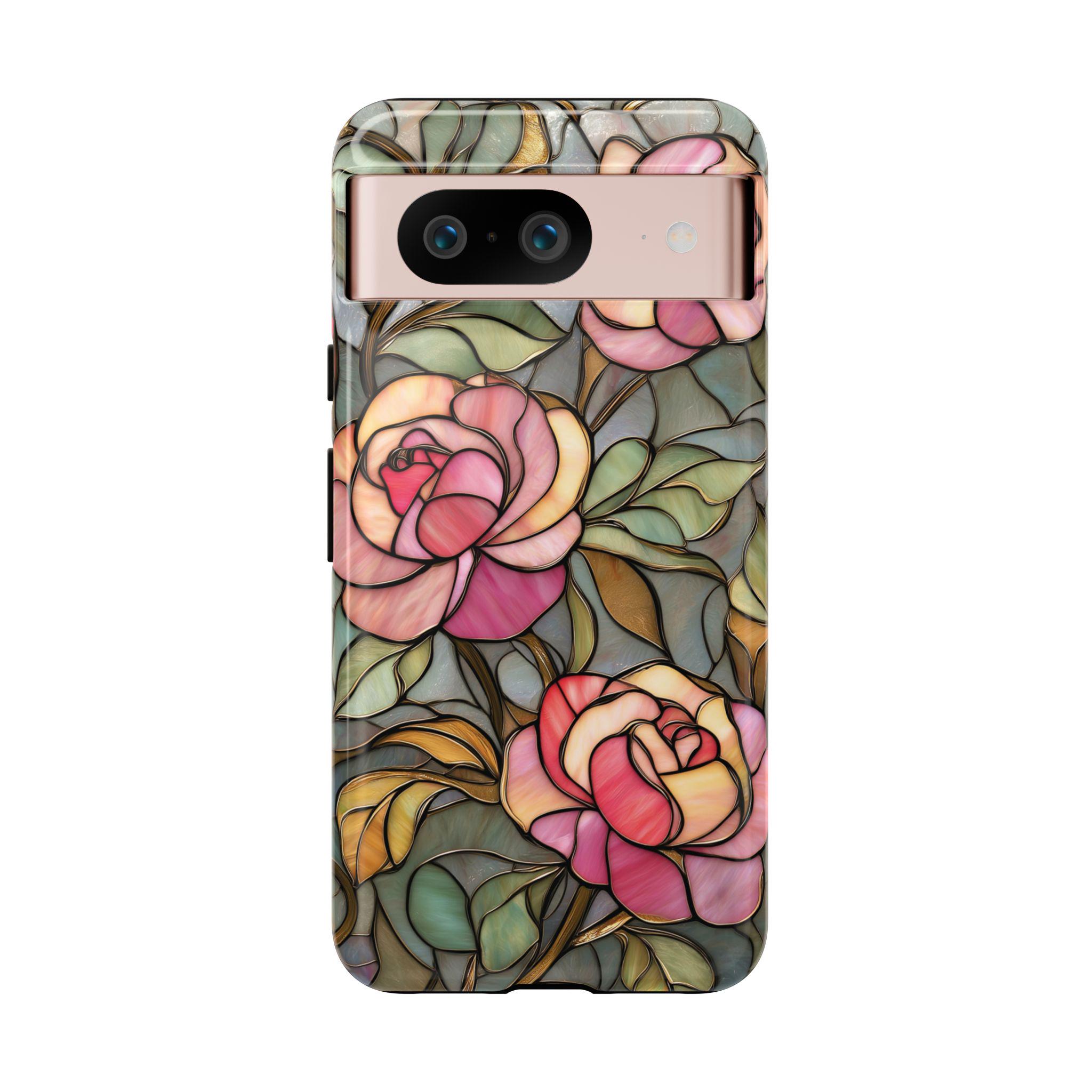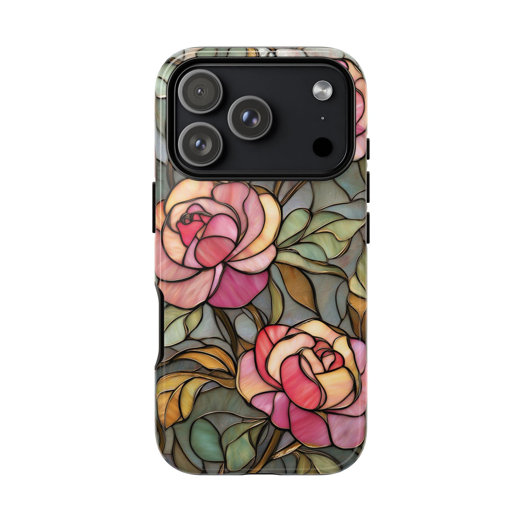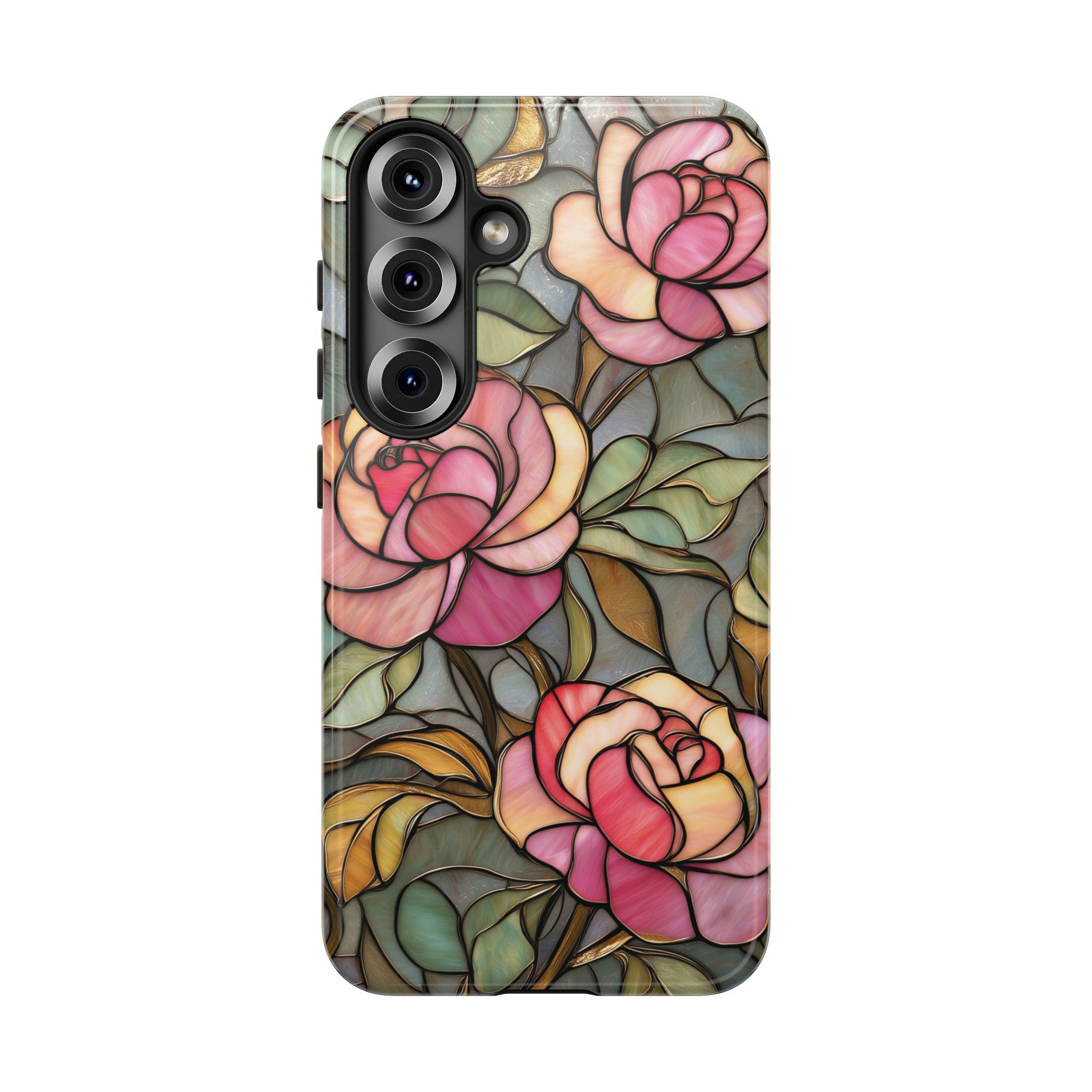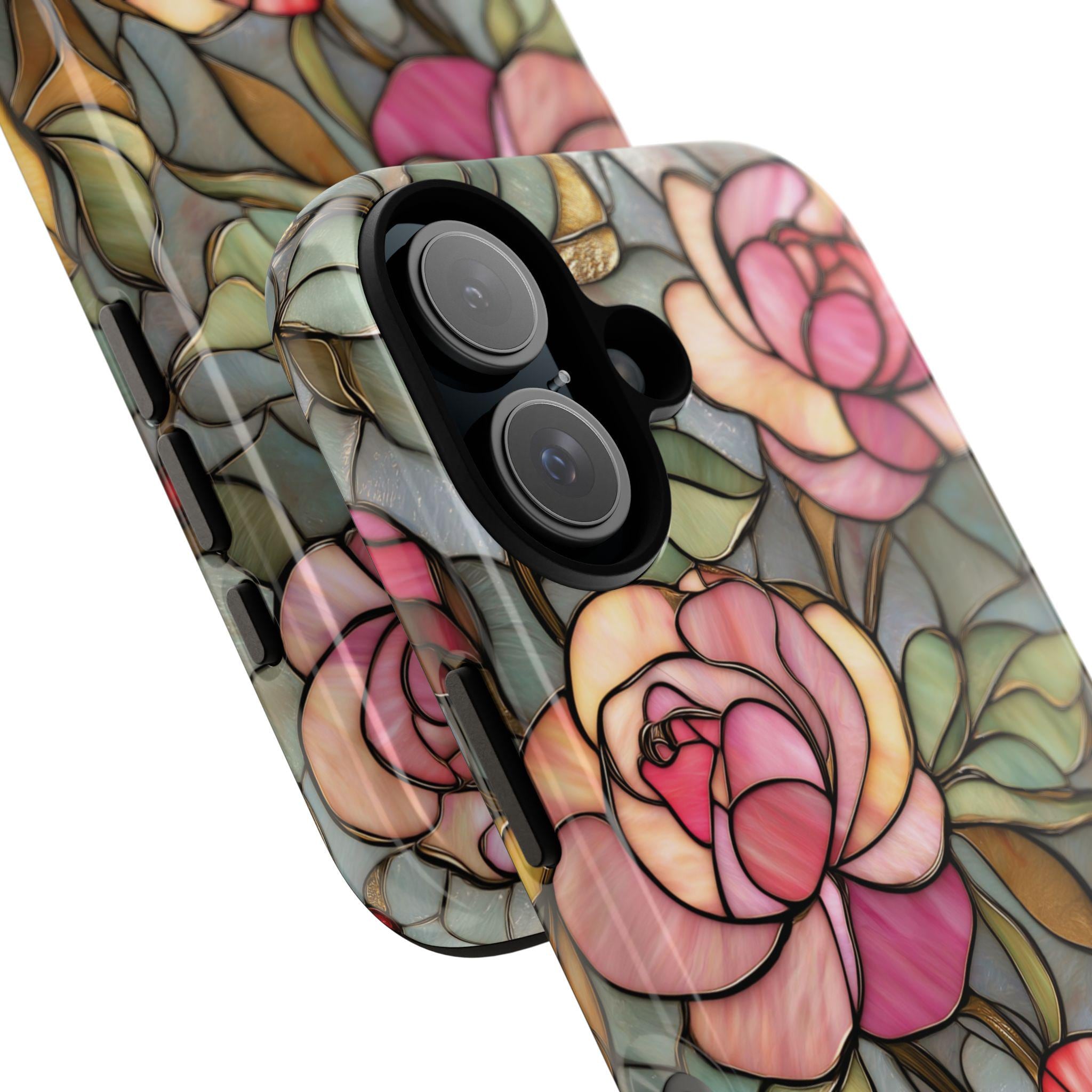 Protect your phone in style with this beautiful stained glass rose tough phone case. Featuring soft pink roses and delicate botanical details inspired by vintage stained glass art, this design adds an elegant, romantic touch to your everyday look. The blend of floral tones and artistic style makes it perfect for anyone who loves feminine, floral, or cottagecore aesthetics. Made for both beauty and durability, this tough case helps protect your phone from everyday drops, bumps, and scratches while keeping your device looking unique and stylish.