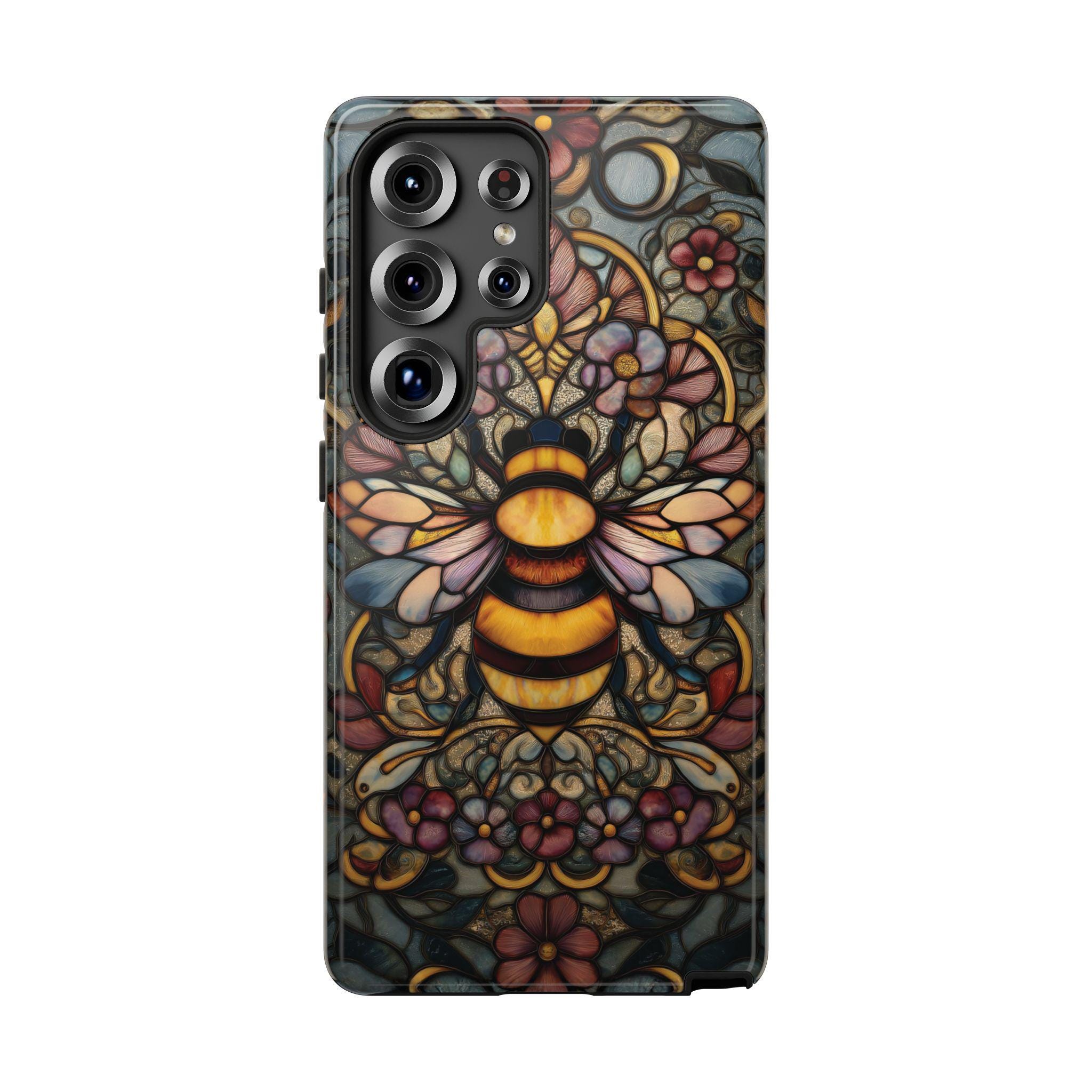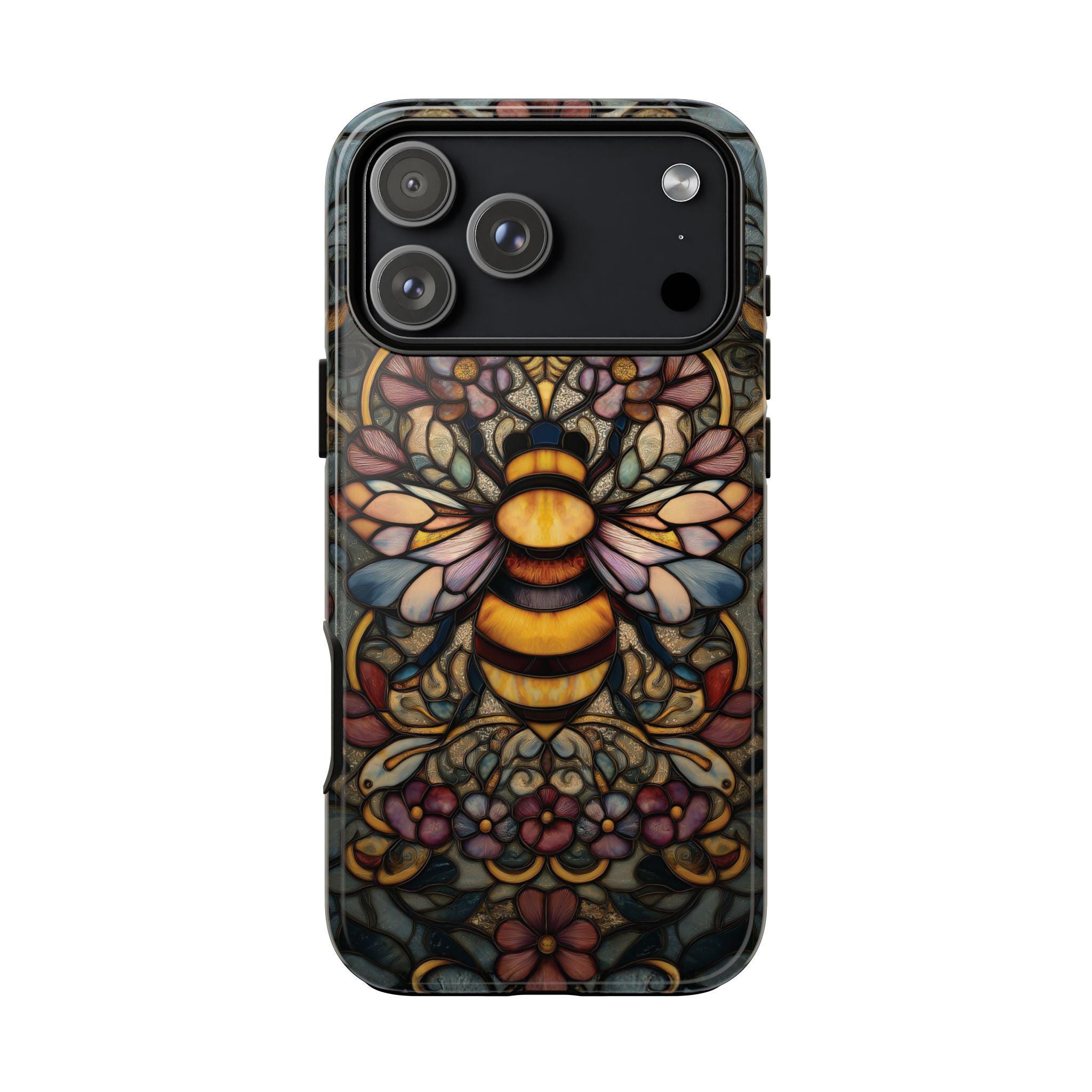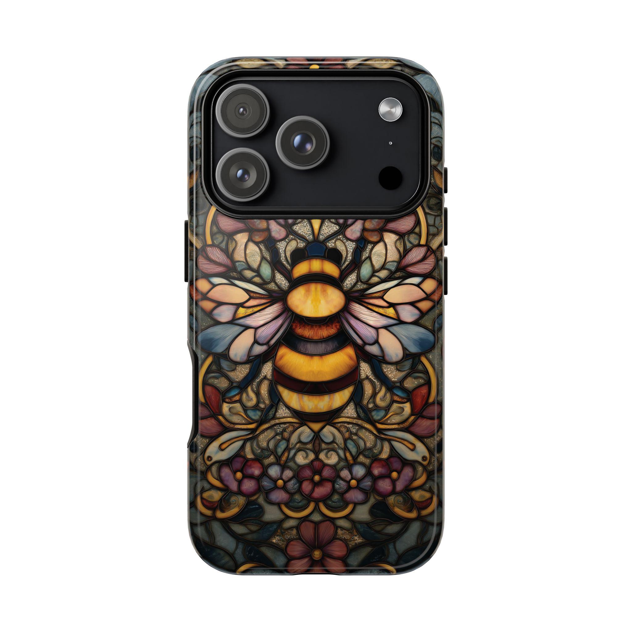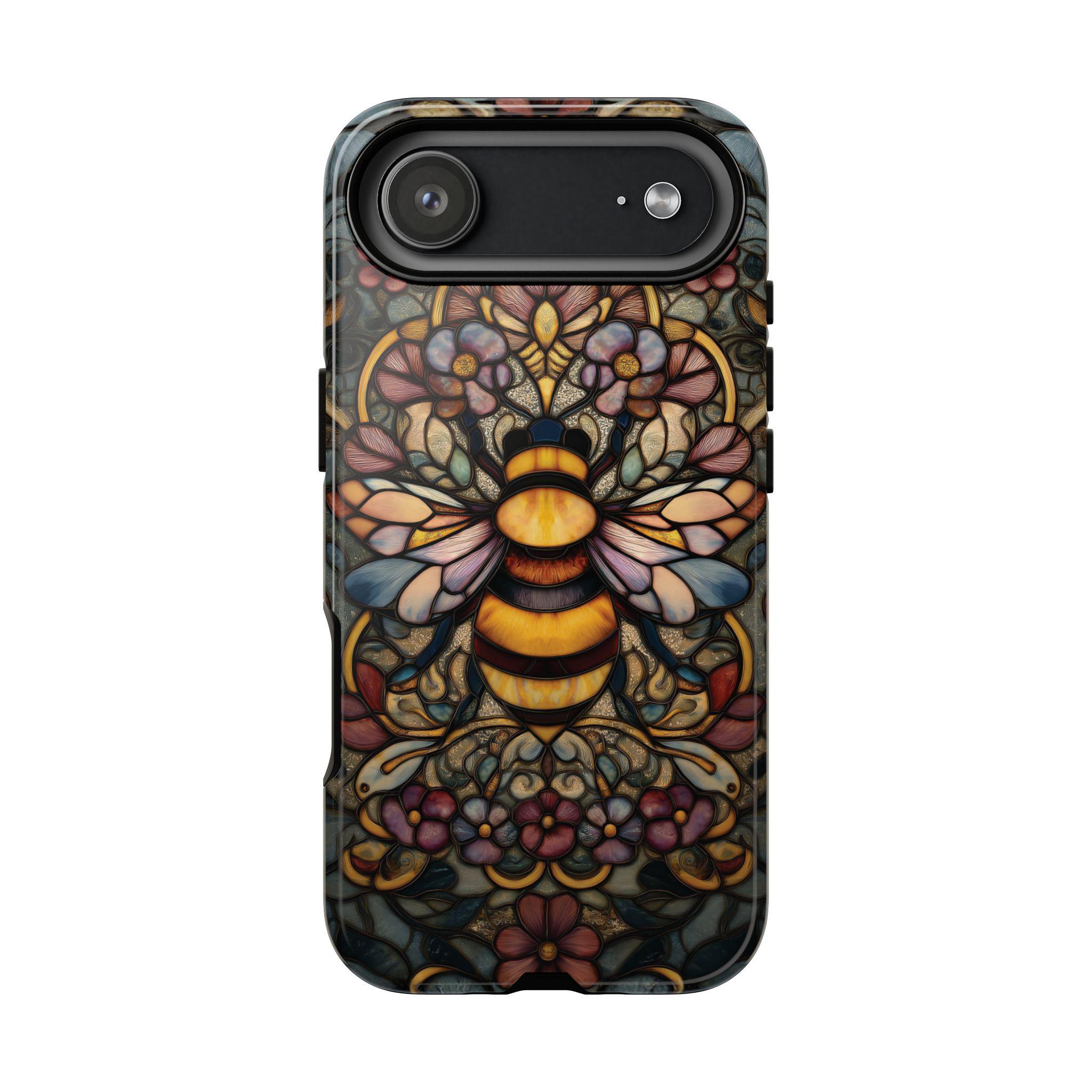 Protect your phone in style with this durable and eye-catching phone case featuring a stunning stained glass-inspired bee design. Perfect for nature lovers and art enthusiasts, this case combines vibrant colors and intricate patterns to not only safeguard your device from everyday bumps and scratches but also make a bold statement. Elevate your phone's look while ensuring maximum protection with this unique and artistic accessory.