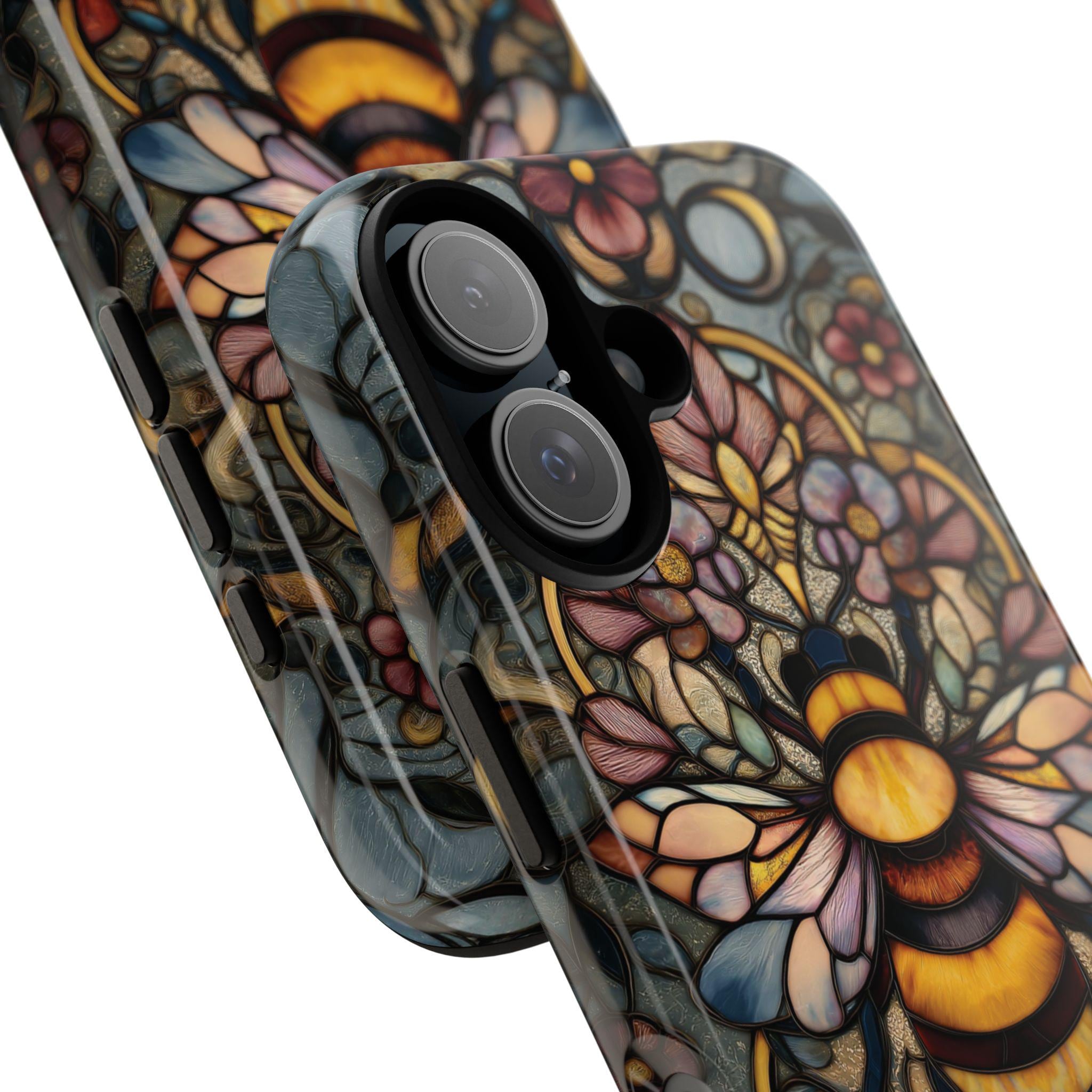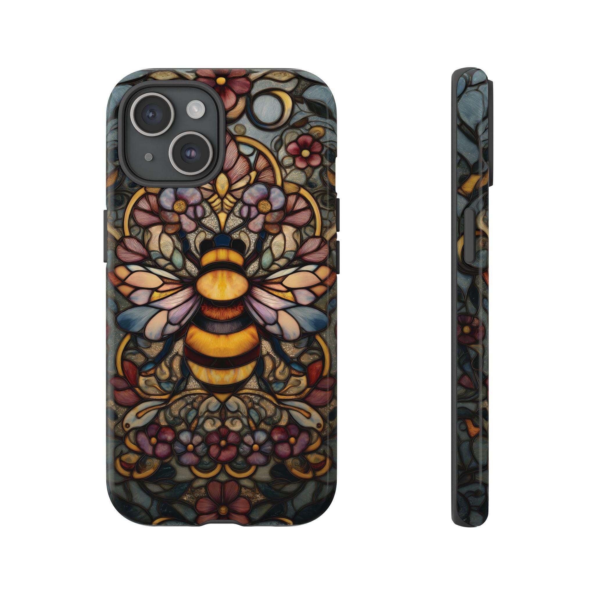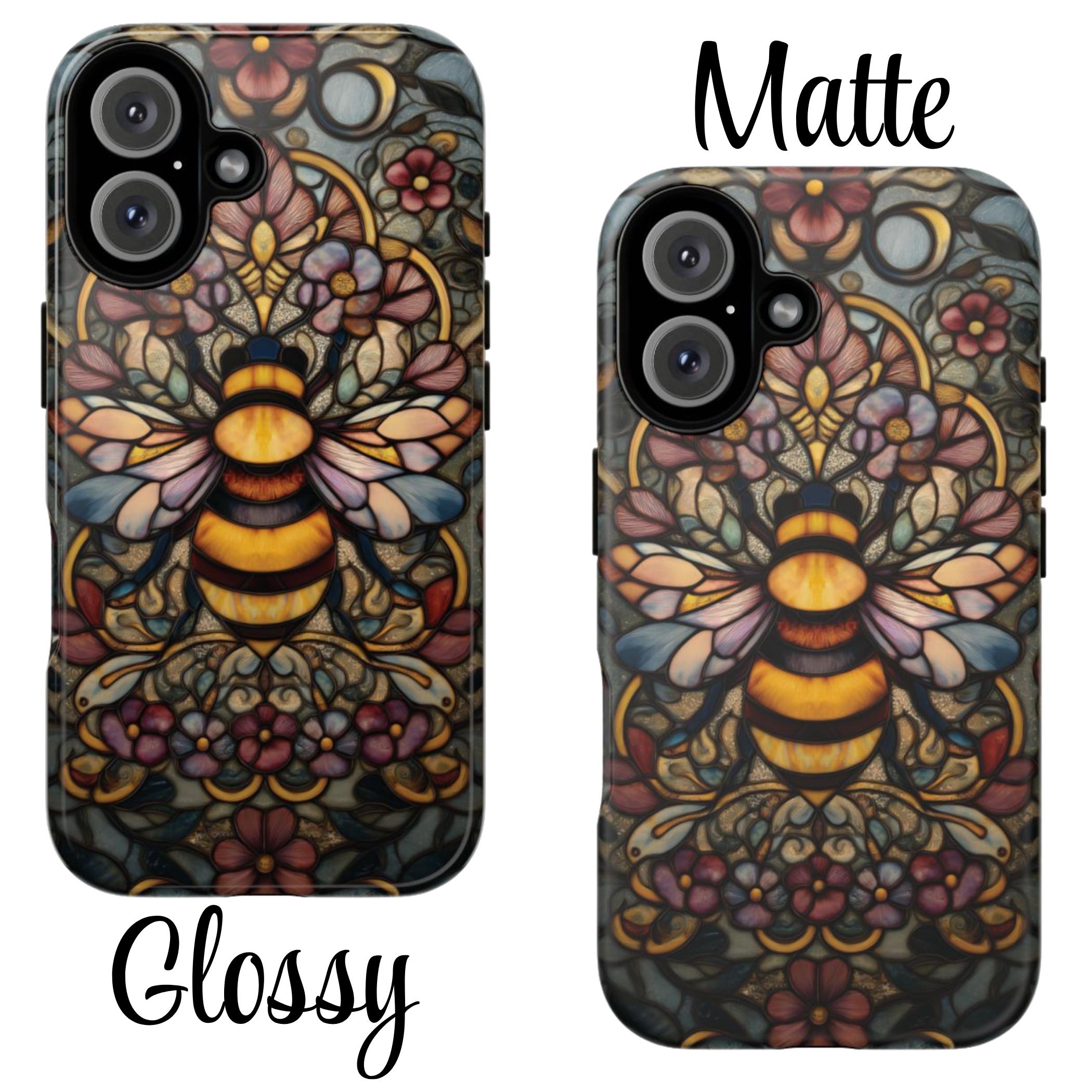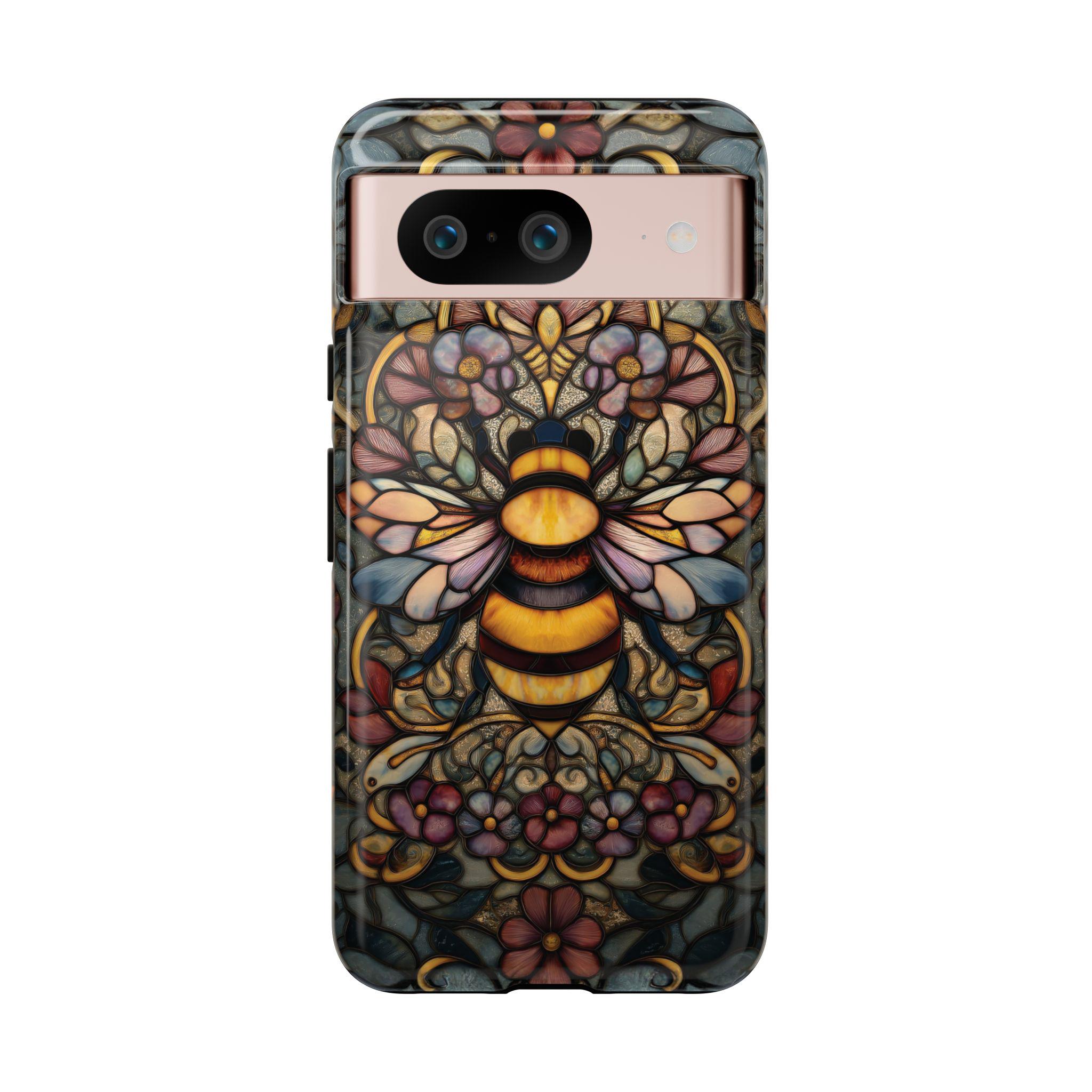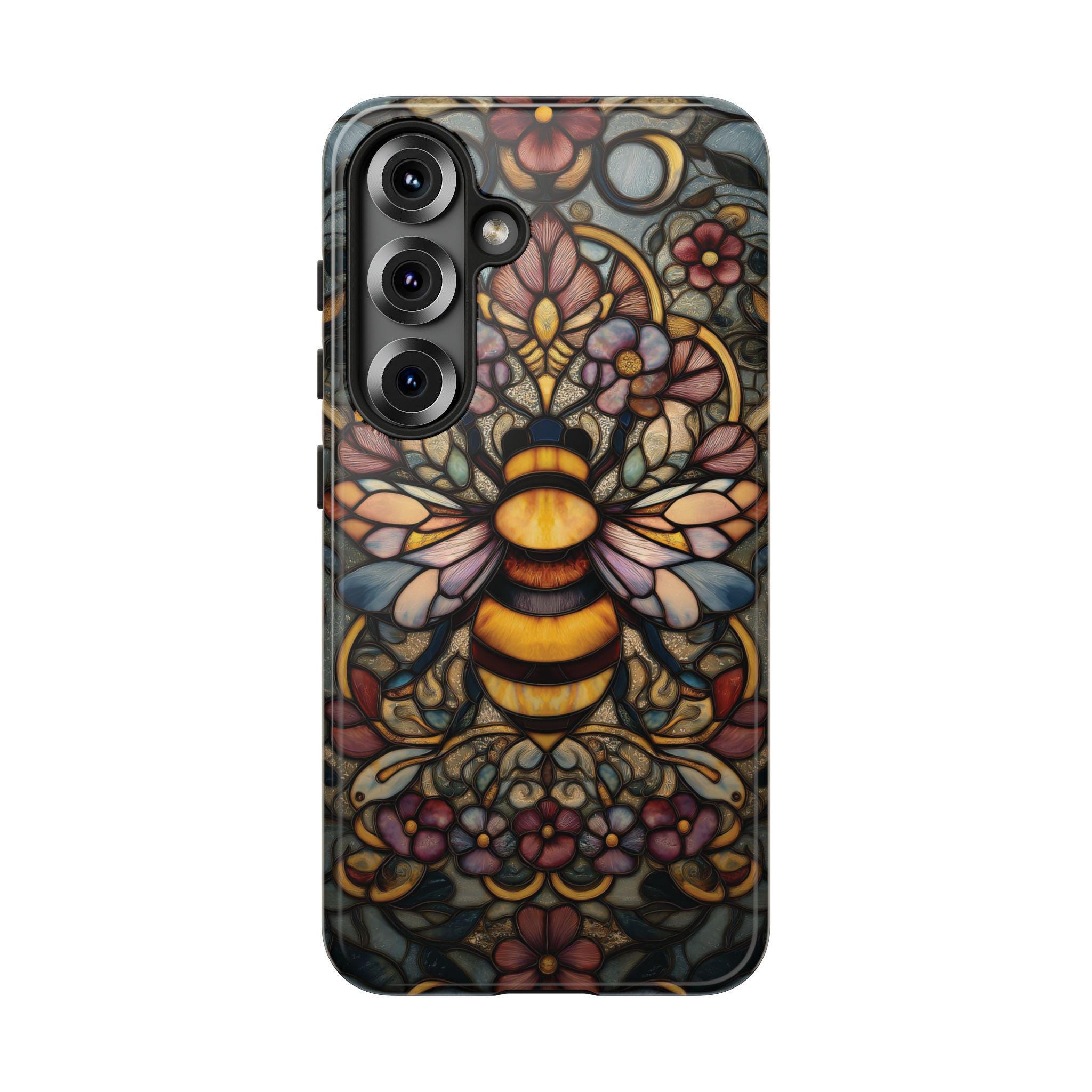 Protect your phone in style with this durable and eye-catching phone case featuring a stunning stained glass-inspired bee design. Perfect for nature lovers and art enthusiasts, this case combines vibrant colors and intricate patterns to not only safeguard your device from everyday bumps and scratches but also make a bold statement. Elevate your phone's look while ensuring maximum protection with this unique and artistic accessory.